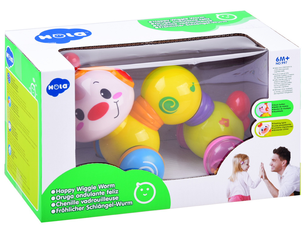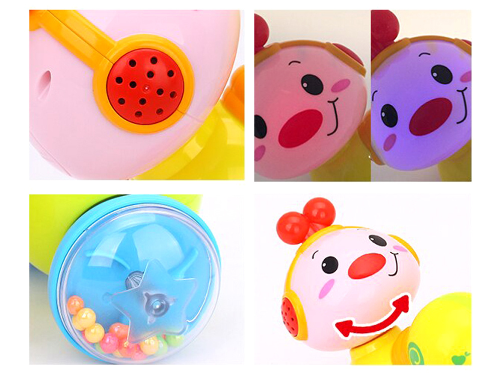 Hlava hračky svieti a mení farby podľa toho, ako hrá hudba. Hlava húsenice je pohyblivá a možno ju otáčať doľava a doprava.