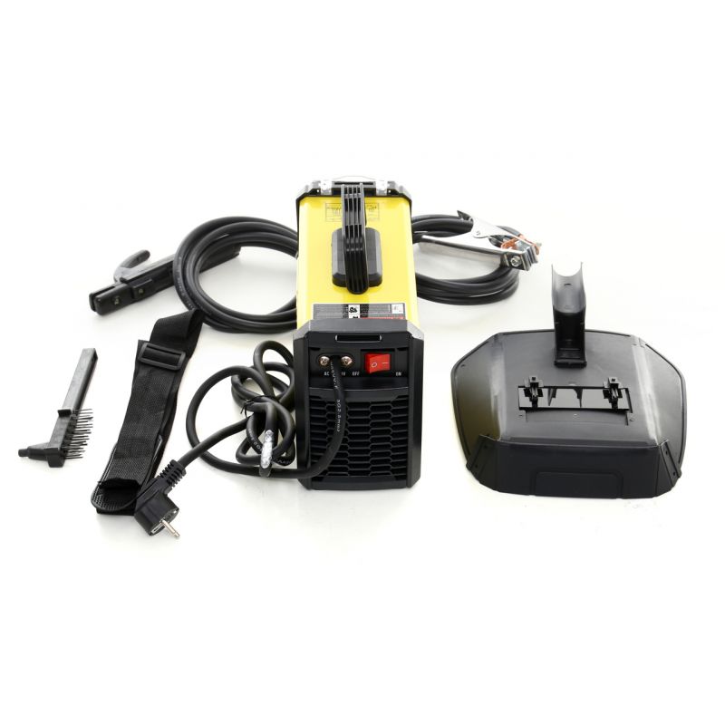 • sada obsahuje bohatú výbavu: zváračku, zvárací kábel MMA DIN s držiakom elektródy, zemniaci kábel DIN so svorkou, ochranný štít so sklom, kladivo s kefou