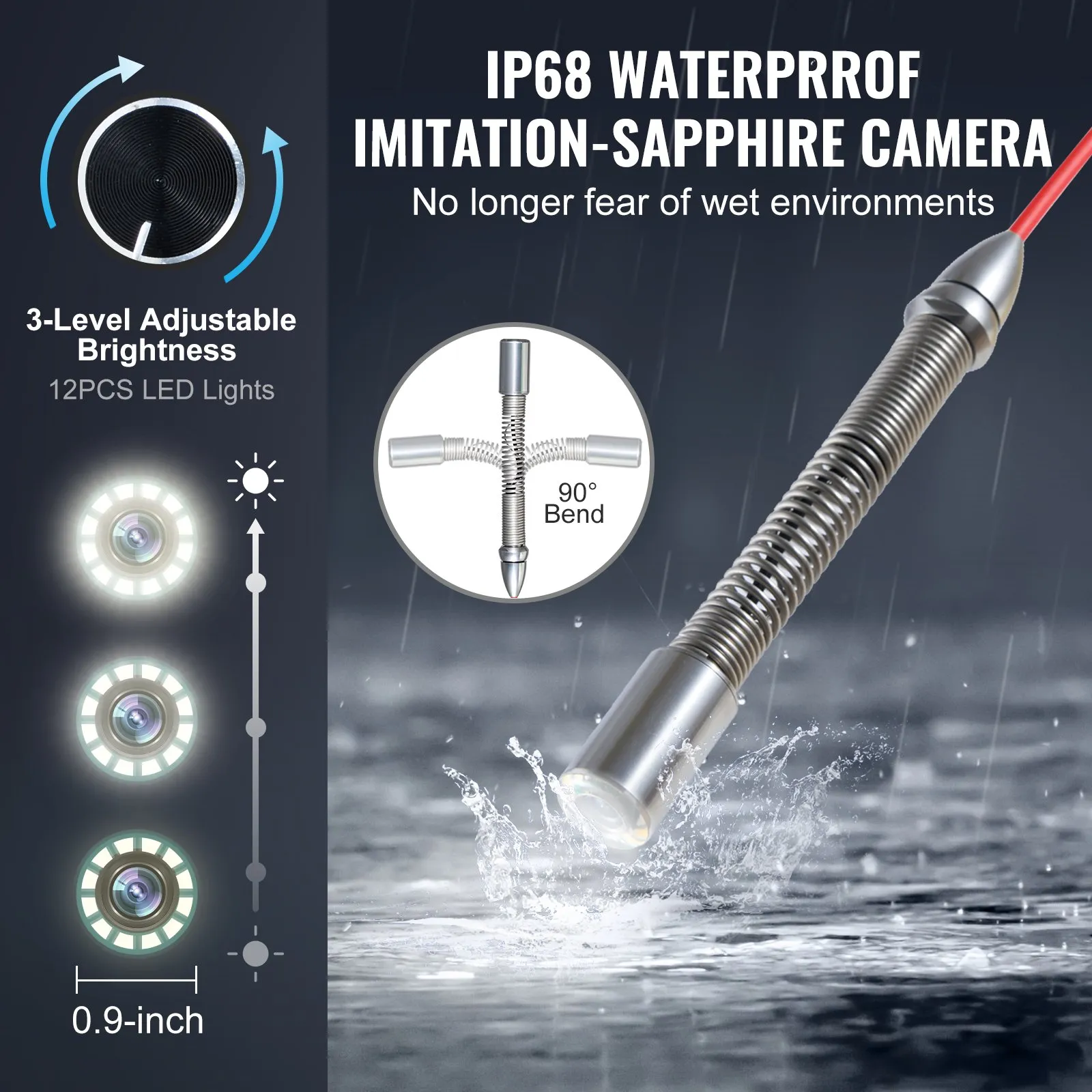 Profesionálna priemyselná kamera na opravu potrubí: Inšpekčná kamera VEVOR Snake je vybavená ultra dlhým káblom s dĺžkou 100 metrov, ktorý je vhodný pre 99,9 % stredných až veľkých a mimoriadne veľkých projektov opráv potrubí. Jej robustný rám z nehrdzavejúcej ocele poskytuje stabilnú oporu a pomocné kolieska zaisťujú jednoduchú mobilitu. Nabíjateľná lítiová batéria s kapacitou 4500 mAh umožňuje 6 – 8 hodín nepretržitej prevádzky, vďaka čomu je tento inštalatérsky nástroj prvou voľbou pre inštalatérov, dodávateľov, inšpektorov, technikov a komunálnych pracovníkov.