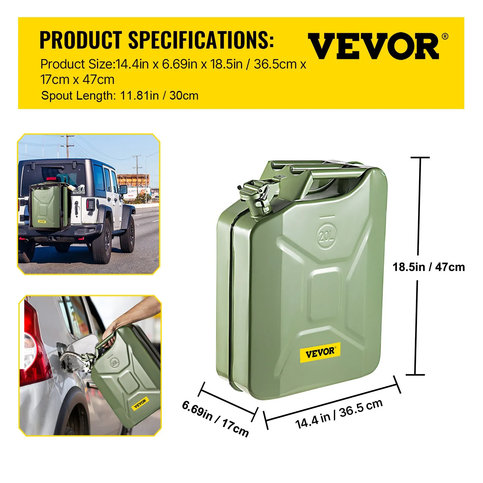 • Kanister vo vojenskom štýle: Tento kanister vo vojenskom štýle je bezšvíkovo zvarený z 0,8 mm hrubej ocele valcovanej za studena a je dostatočne pevný, aby uniesol hmotnosť dospelého muža. Je potiahnutý zelenou farbou odolnou voči hrdzi a má konkávny spodný okraj, ktorý výrazne znižuje opotrebenie. Bezpečne skladujte svoje palivo dlhodobo.