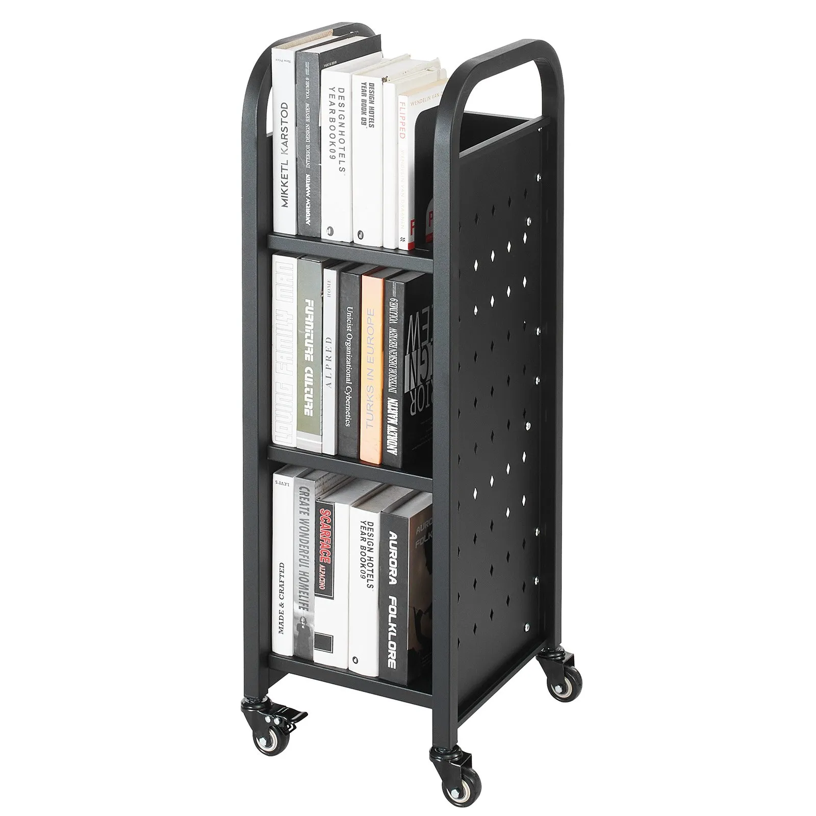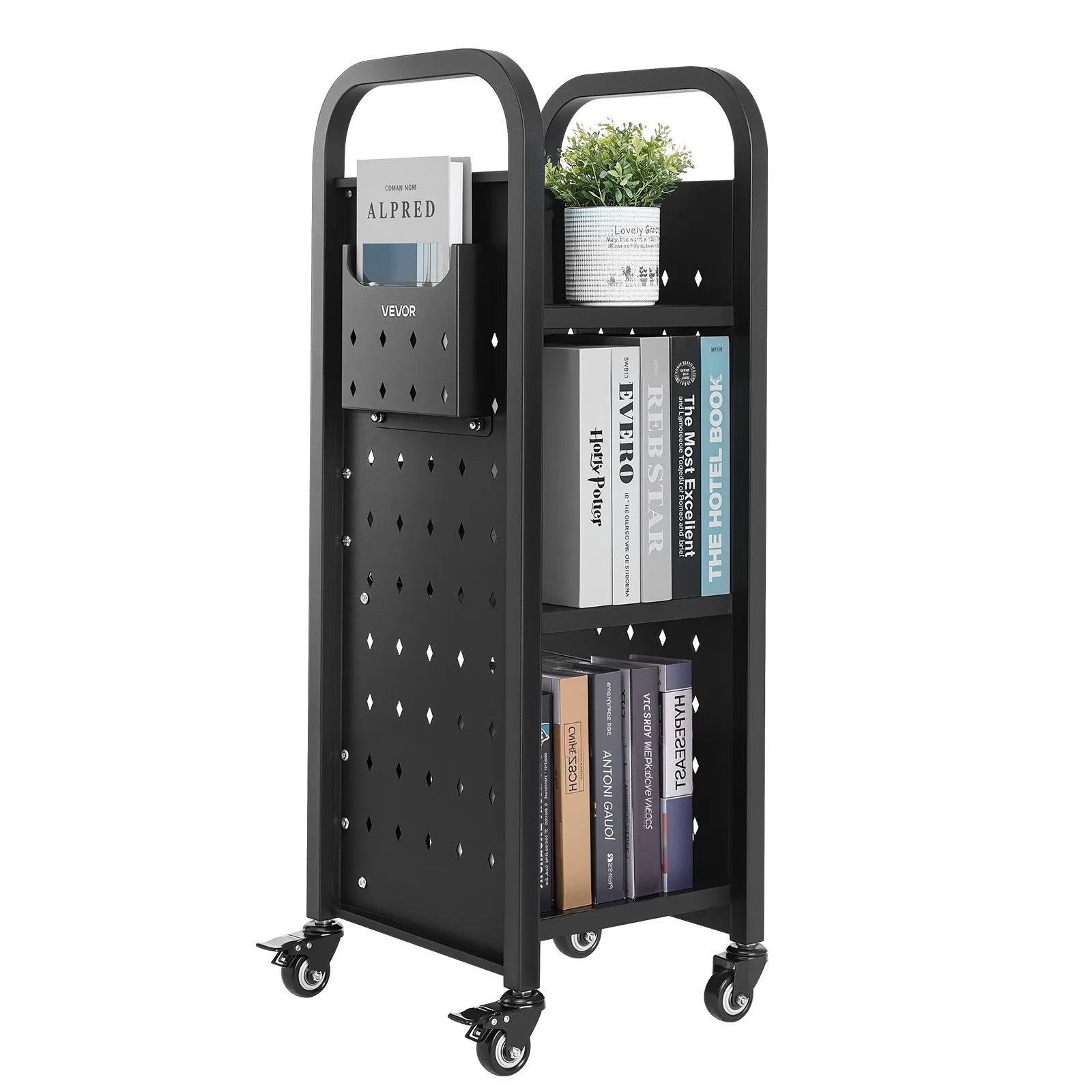 Knižný vozík, nosnosť 100 kg, knižničný vozík, 32 x 35 x 93,5 cm, jednostranná knižnica v tvare L s dvojitými brzdovými kolieskami, knižnicový vozík do obývačky, kancelárie, školy, čierny