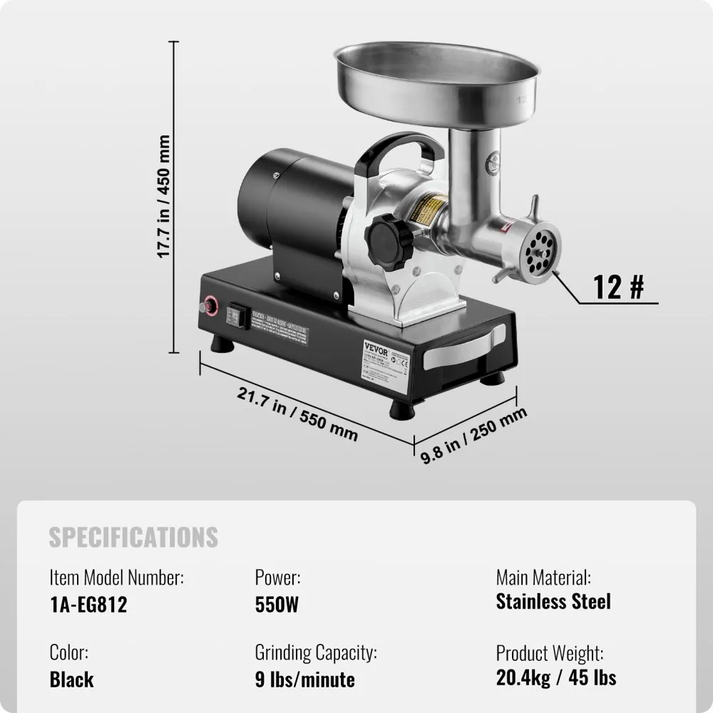 • Rýchle mletie: Komerčný mlynček na mäso s priemerom mletia 30 cm je vybavený vysokoúčinným motorom z čistej medi s výkonom 550 W, ktorý dokáže zomlieť 4,08 kg mäsa za minútu. Môže bežať nepretržite, vďaka čomu je ideálny pre veľké komerčné mlynčeky na mäso. Nenechávajte mlynček bežať dlhší čas na voľnobeh, pretože by to mohlo poškodiť motor. Nezabudnite zariadenie ihneď vypnúť, keď ho nepoužívate.