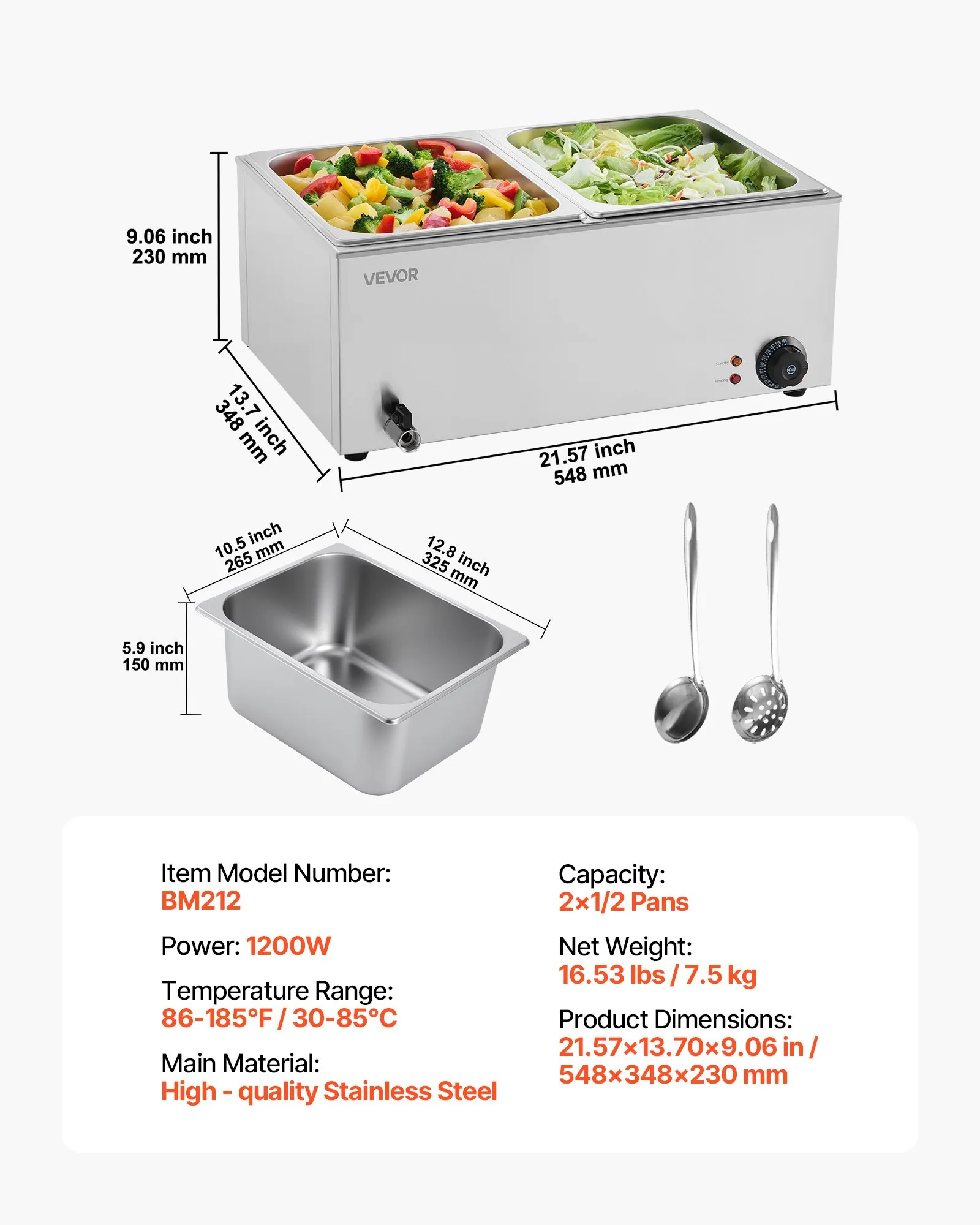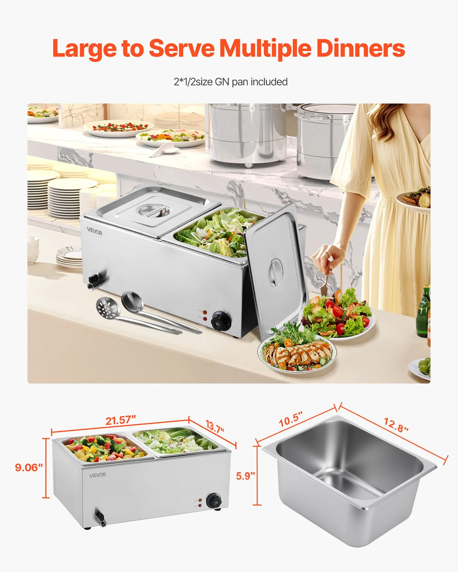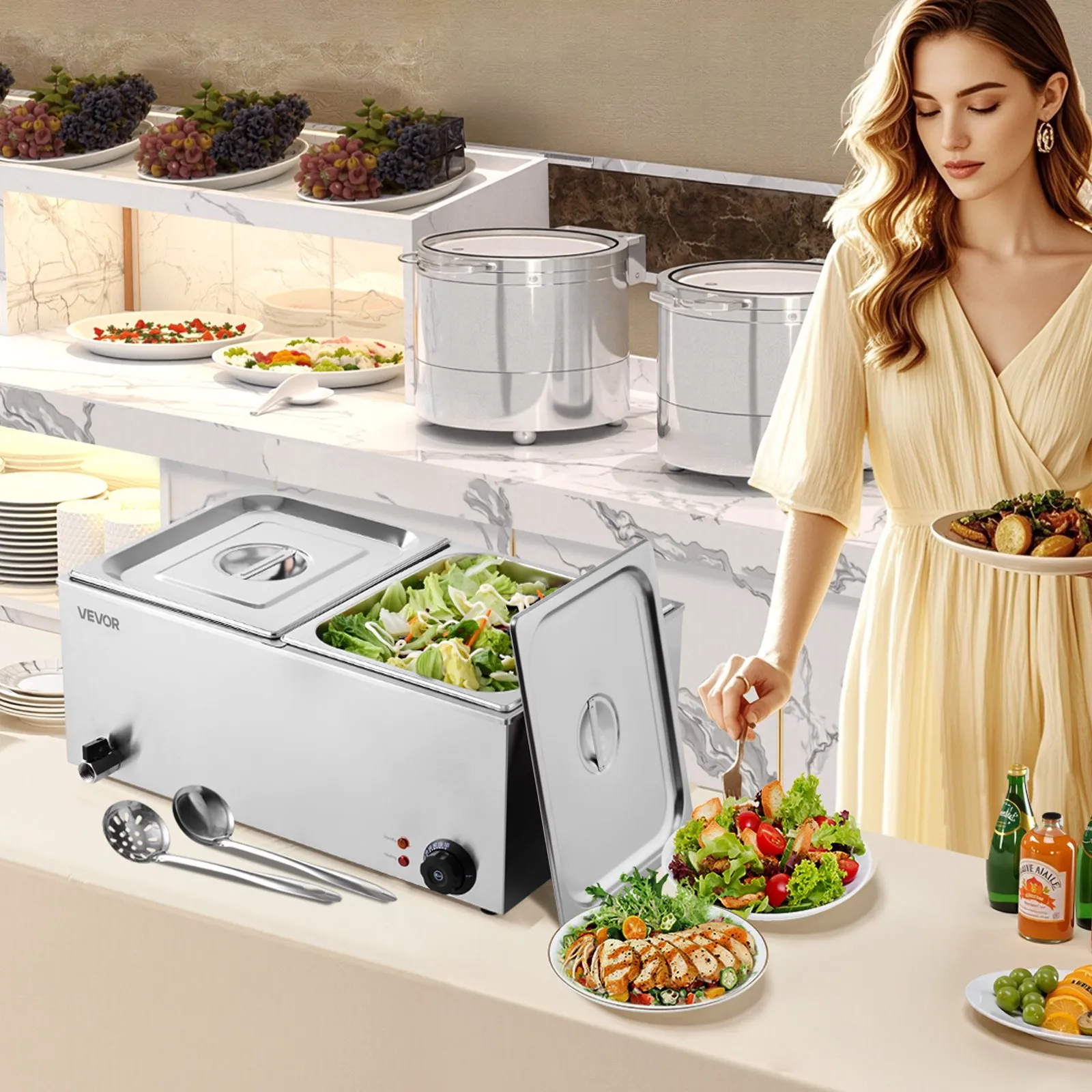 Komerčný ohrievač jedál , elektrický parný stôl s 2 nádobami (veľkosť 1/2), 1200 W, vodný kúpeľ z nehrdzavejúcej ocele s reguláciou teploty od 30 do 80 °C pre cateringové rauty, večierky