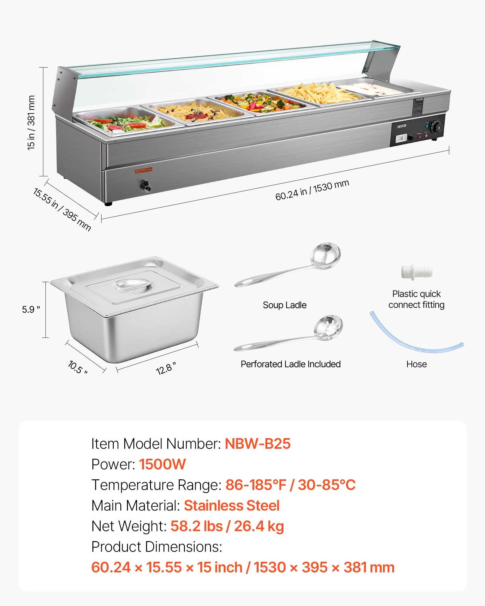 • Odolný voči hrdzi a dlhá životnosť: Tento bufet Marie Buffet je vyrobený výlučne z nehrdzavejúcej ocele a ponúka maximálnu odolnosť. Výkonné 1500W vykurovacie teleso v tvare U, tiež vyrobené z nehrdzavejúcej ocele 304, sa rýchlo a rovnomerne zahrieva, udržiava teplo a znižuje riziko hrdze.