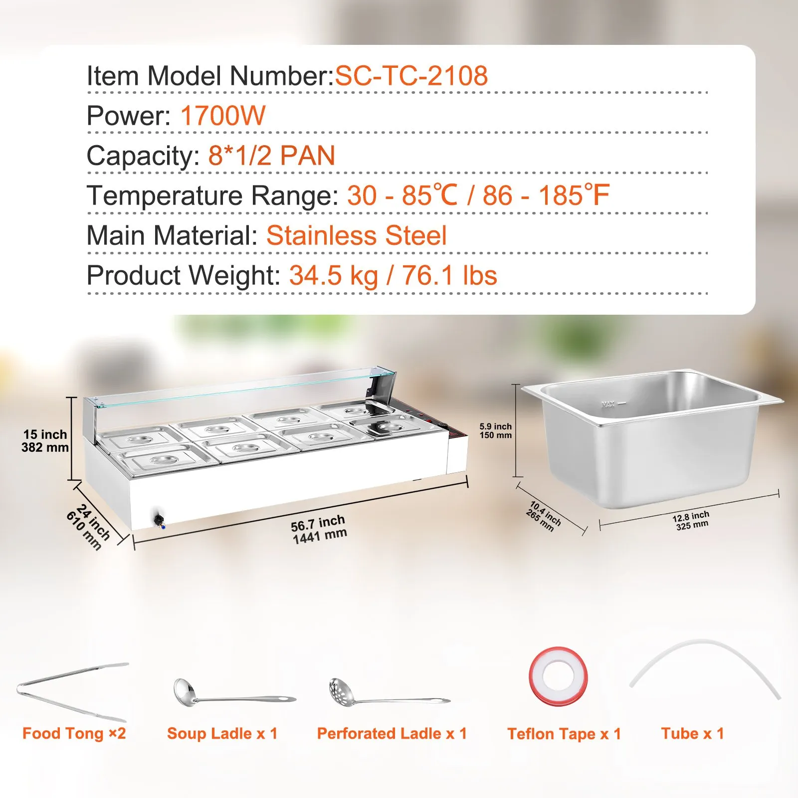 Komerčný ohrievač potravín s 8 nádobami (každá s objemom 8 Qt / 1/2 veľkosti), elektrický parný stôl so skleneným krytom, pracovná doska z nehrdzavejúcej ocele 1700 W, kúpeľňový kúpeľ typu bufet, regulácia teploty 30–85 °C