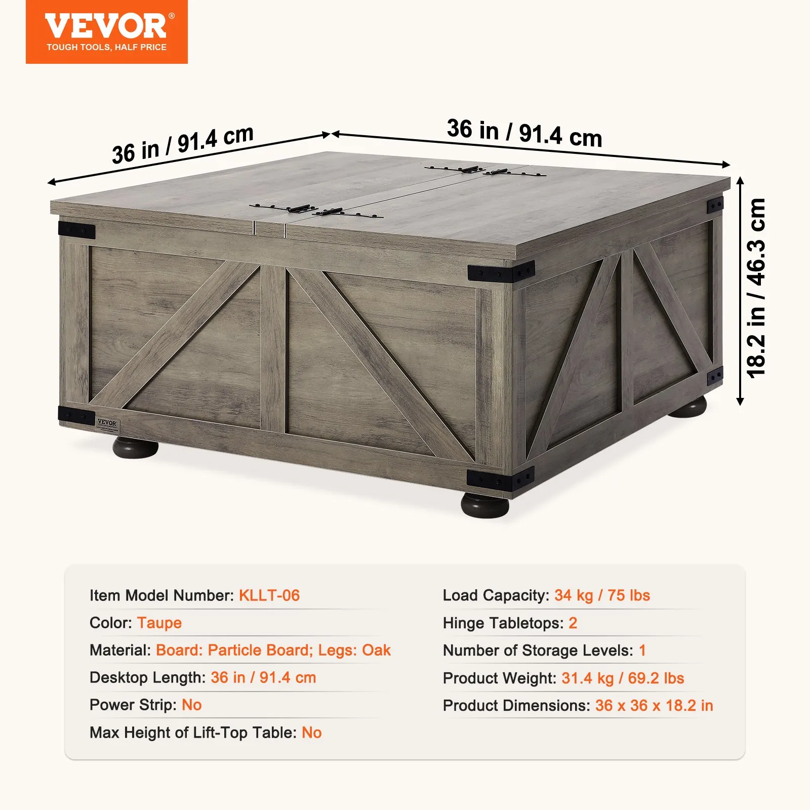 Konferenčný stolík vo farmárskom štýle, 914 mm, štvorcový konferenčný stolík s pántami a veľkým úložným priestorom, rustikálny drevený koktailový stolík do obývačky, spálne, bytu, štúdia