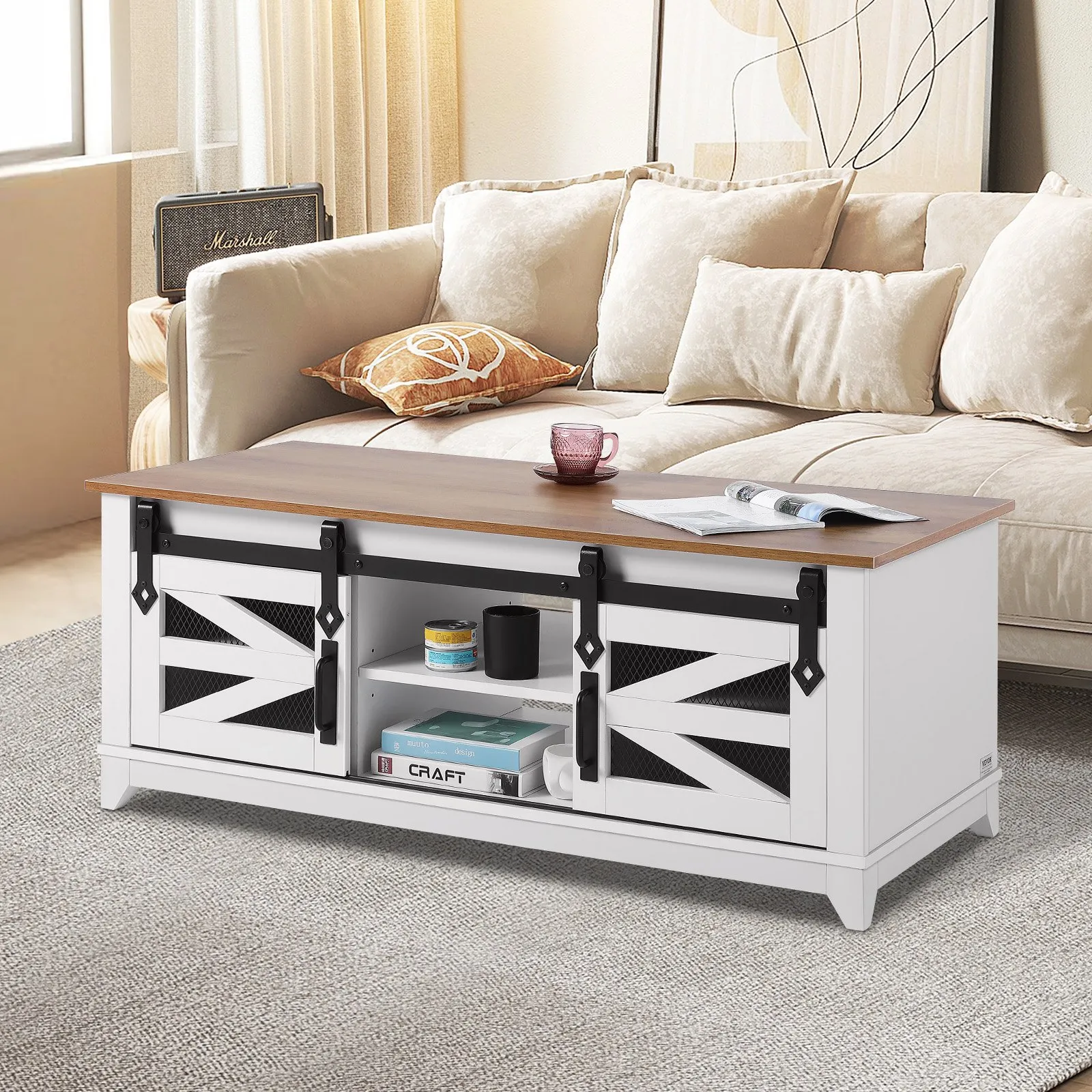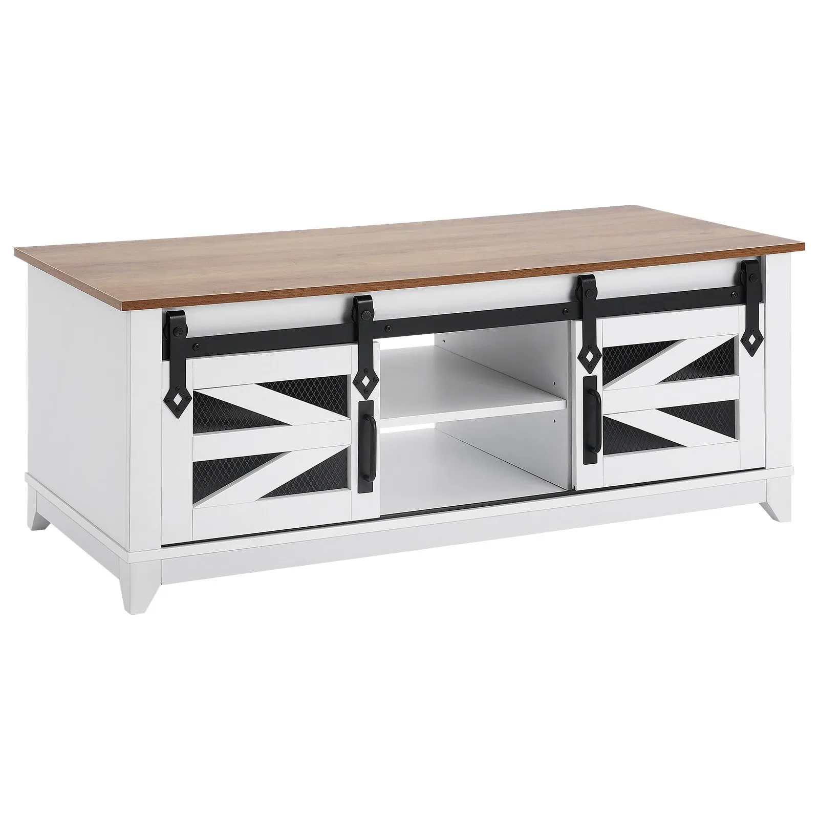 Posuvné dvere v štýle stodoly: Tento konferenčný stolík vo vidieckom štýle má posuvné dvere v štýle stodoly so zabudovanou kovovou sieťovinou a kovaním v tmavohnedej železnej farbe, ktoré mu dodávajú šarm a estetickú príťažlivosť a zároveň mu dodávajú osobitý vzhľad. Vysokokvalitné koľajnice zaisťujú plynulý chod a umožňujú jednoduchý prístup k skrinkám a zároveň šetria miesto.