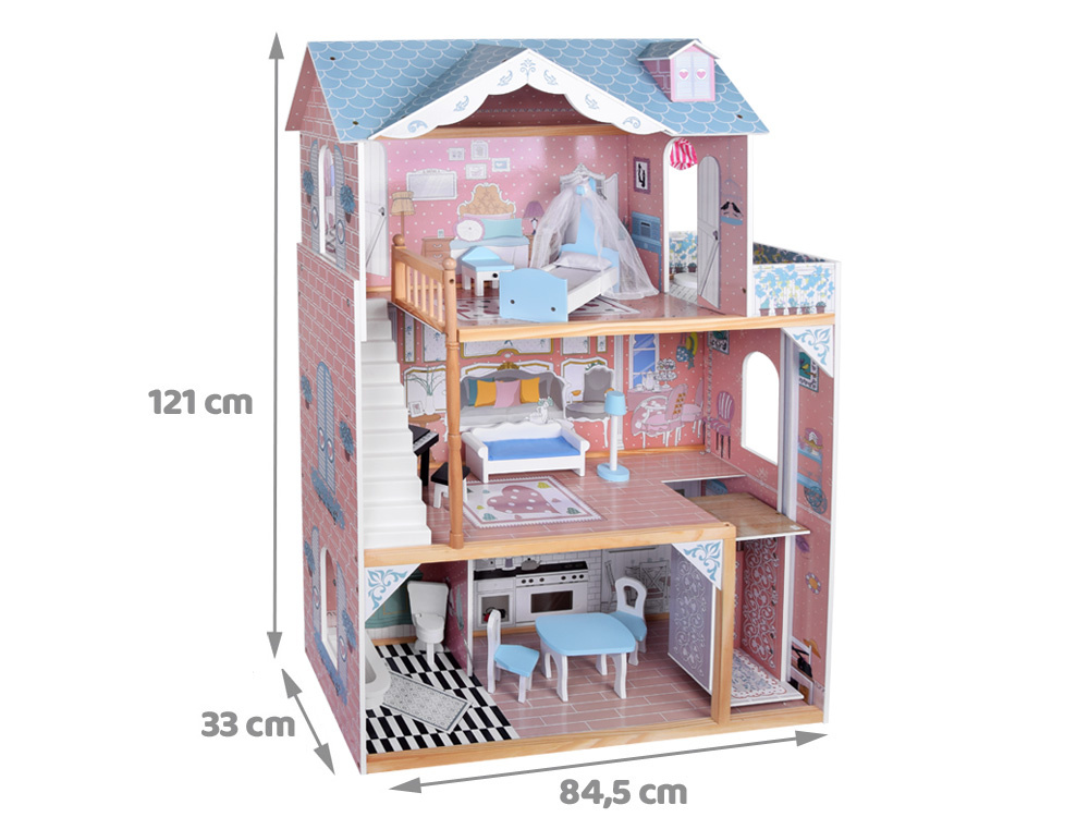 Tento mimoriadne veľký drevený domček v tlmených pastelových farbách je hračkou snov pre každé malé dievčatko. Vďaka svojej pevnej konštrukcii a elegantnému dizajnu vám tento domček poskytne mnoho rokov kreatívnej hry.