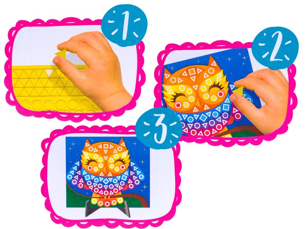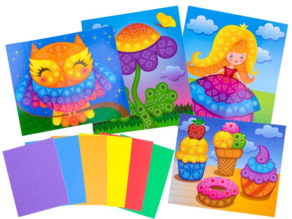 Kreatívna sada pre deti, ktoré majú radi umenie a remeslá. Táto sada pozostáva z farebných obrázkov, ktoré sa dajú nalepiť na povrch pomocou penových štvorcov a podľa toho upraviť farby a tvary.