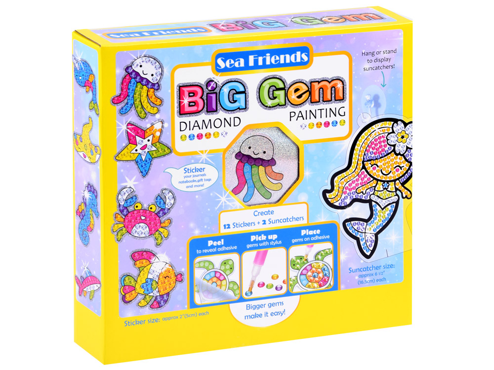 Kreatívna sada na diamantové maľovanie SEA je najtrendovejšou kreatívnou aktivitou pre deti tejto sezóny. Sada vám umožňuje vytvárať krásne vzory s rozprávkovo farebnými diamantmi. Hra spočíva vo výbere vhodných farieb diamantov a ich prenose do šablóny pomocou lepidla a špeciálneho pera. Po usporiadaní dielikov vytvoríte krásnu, farebnú dekoráciu. Pomocou priložených plastových stojanov a silikónových prísaviek s háčikmi môžete svoje výtvory vystaviť na stole, poličke, zavesiť na okno alebo zrkadlo, alebo ich použiť na ozdobenie obľúbeného zošita, priečinka alebo diára.
