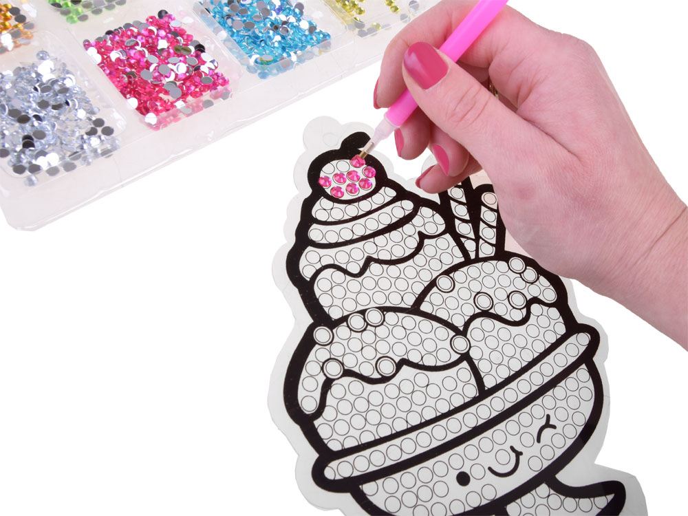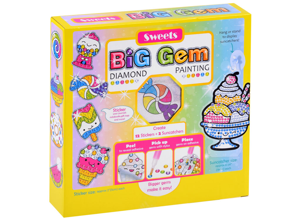 Kreatívna diamantová vyšívacia sada SWEETS je najtrendovejšou kreatívnou aktivitou pre deti tejto sezóny. Sada vám umožňuje vytvárať krásne vzory s rozprávkovo farebnými diamantmi. Hra spočíva vo výbere vhodných farieb diamantov a ich prenesení na šablónu pomocou lepidla a špeciálneho pera. Po usporiadaní dielikov vytvoríte krásnu, farebnú dekoráciu. Pomocou priložených plastových stojanov a silikónových prísaviek s háčikmi môžete svoje výtvory vystaviť na stole, poličke, okne, zrkadle alebo ich použiť na ozdobenie obľúbeného zošita, priečinka či diára.