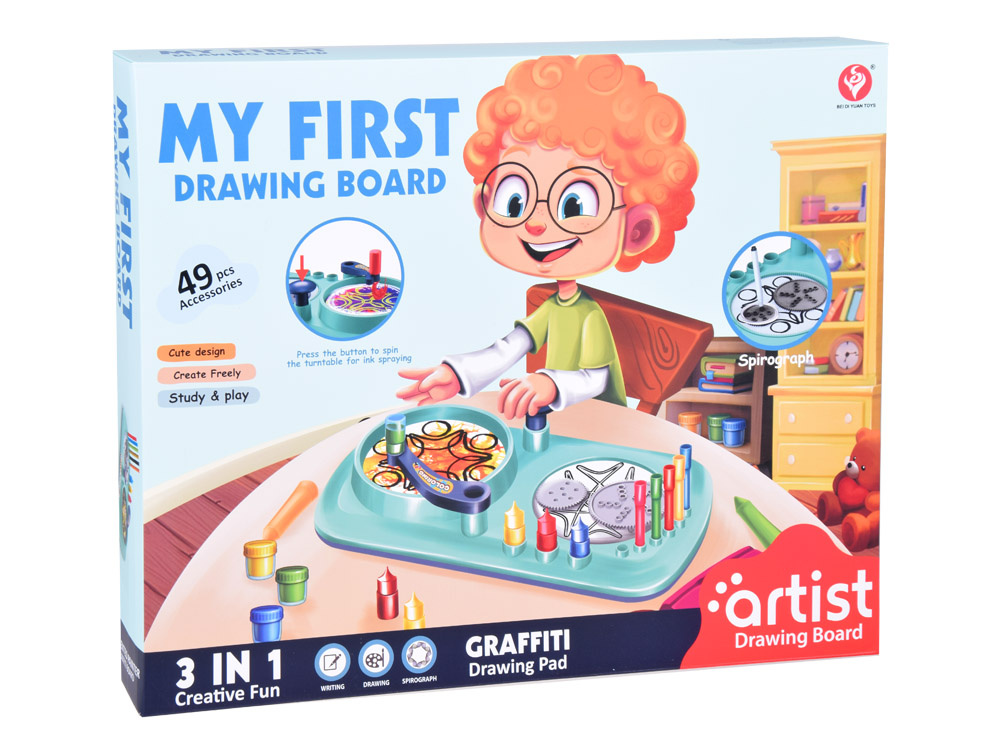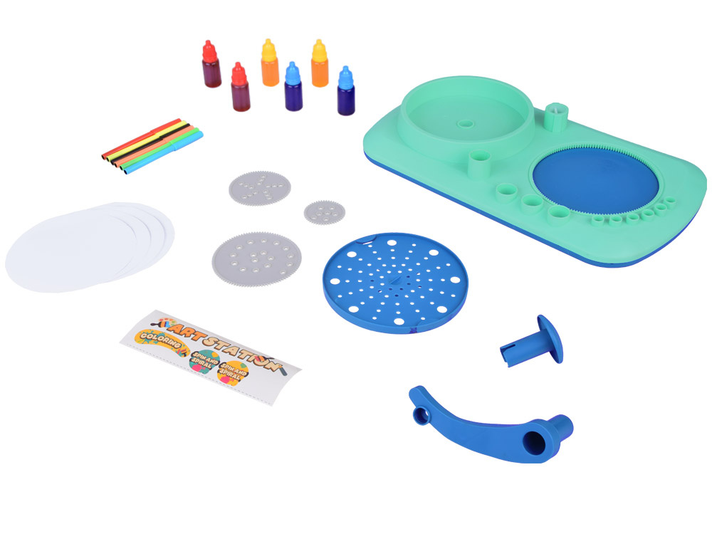 49 dielikov – všetko, čo potrebujete na kreatívnu hru, vrátane farebných fixiek, farieb, rotačnej maliarskej plošiny a spirografických šablón.