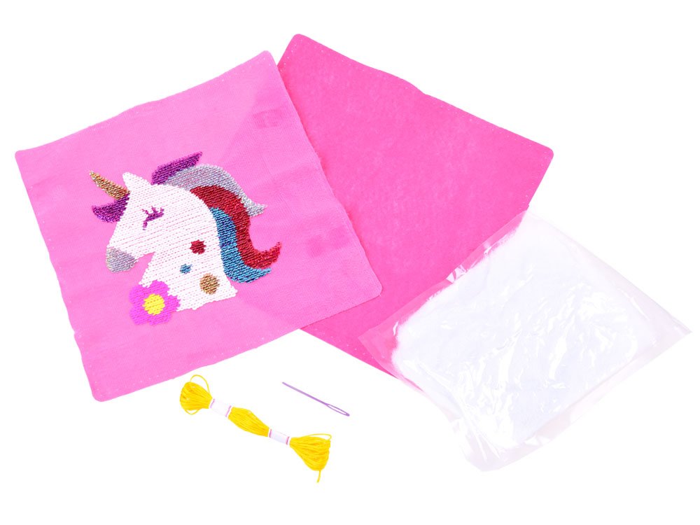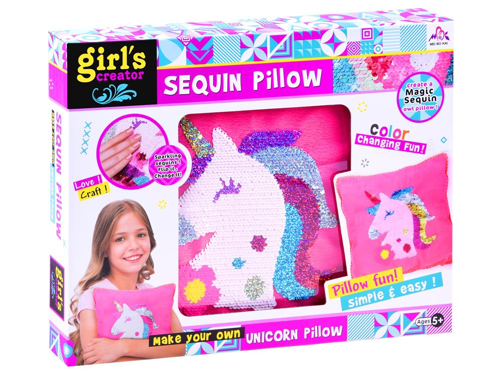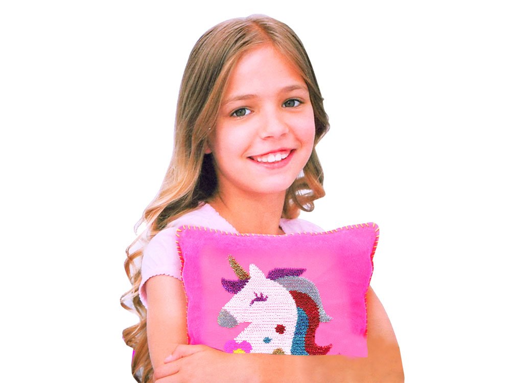 Vankúš s flitrovaným jednorožcom . Táto kreatívna sada pre vašu malú krajčírku vám umožní ušiť si vlastný flitrovaný vankúš s jednorožcom. Očarujúca, ružová, mäkká látka s obrázkom jednorožca poteší každého fanúšika týchto magických stvorení. Navyše, flitre sú obojstranné, takže ich farbu môžete zmeniť pohladením jednorožca!