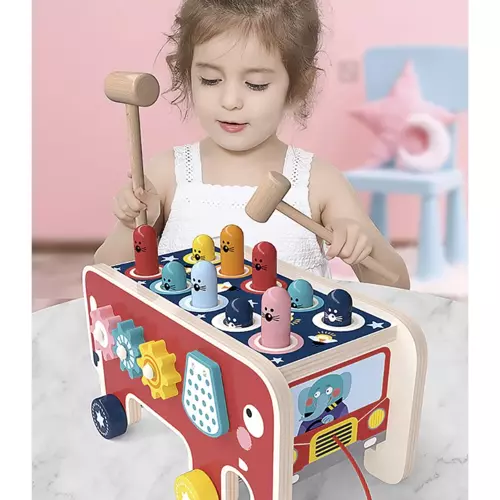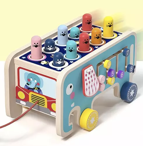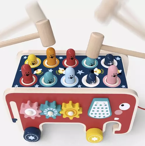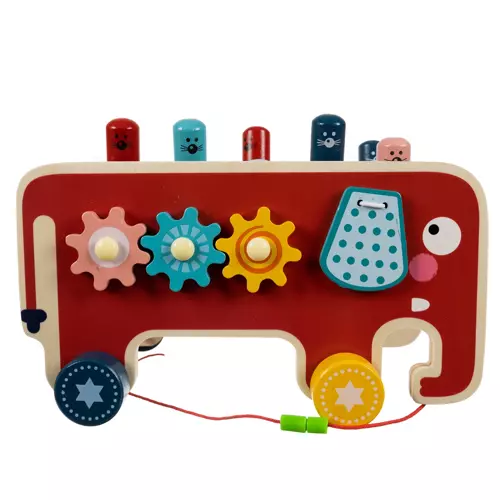 - 4 v 1 – sú v slonovi farebné e steny , a na každej z nich iná úloha pre dieťa. Rotujúce ozubené kolesá, bludisko s číslami, vybíjané, povrázok na vytiahnutie. Tento drevený slon poteší mnoho detí.
