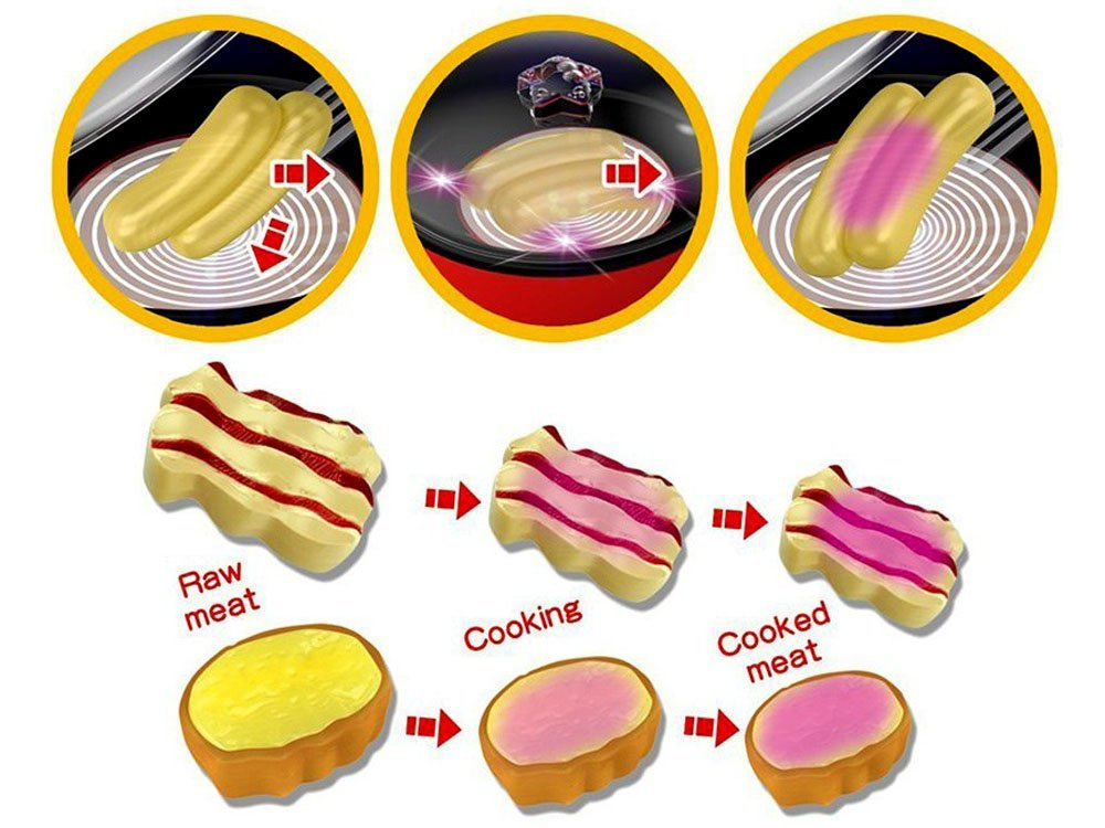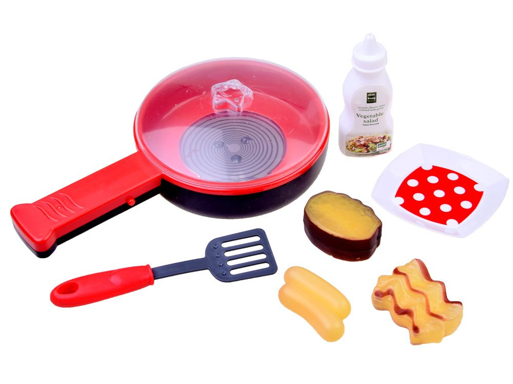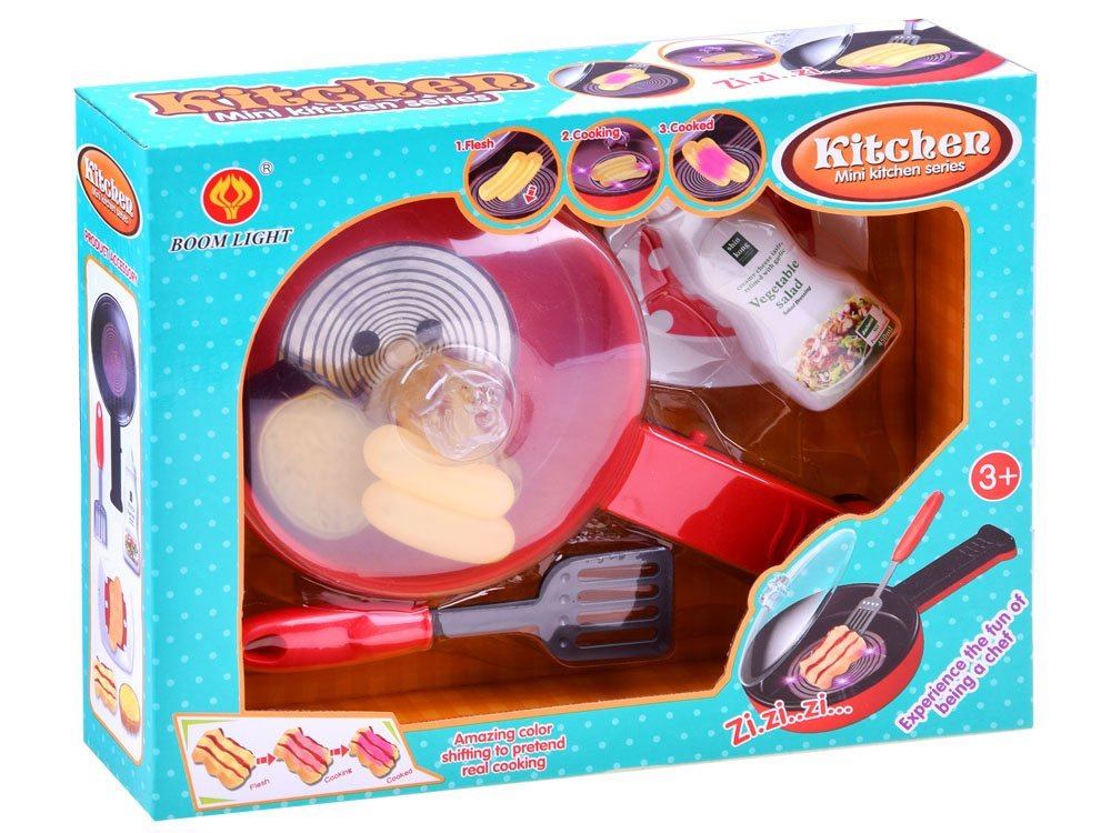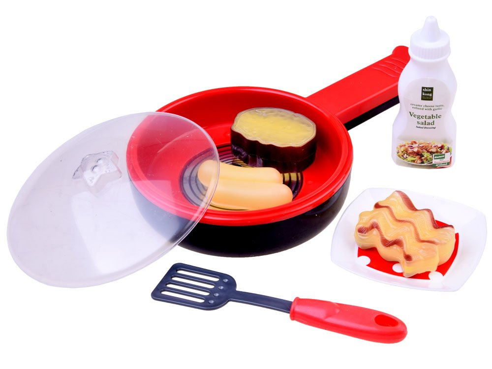 Skvelá sada pre každého malého kulinárskeho nadšenca. S touto sadou si váš malý kuchár pripraví lahodný steak, slaninu alebo chrumkavú klobásu. Stlačením tlačidla na rukoväti sa panvica rozsvieti a vyprážané jedlo bude znieť, akoby sa práve vyprážalo. Okrem toho vyprážané jedlo zmení farbu, keď je vystavené svetlám v strede panvice, vďaka čomu je hranie ešte realistickejšie. Tento produkt rozvíja fantáziu a manuálne zručnosti a poskytuje hodiny zábavy.