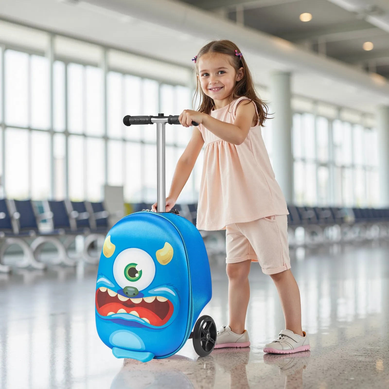Kufor na kolobežku, objem 20 l, cestovný kufor s kolieskami Flash PU, protišmyková rukoväť TPR, maximálna nosnosť 50 kg, detský kufor, príručná batožina, pre deti od 5 rokov, modrý
