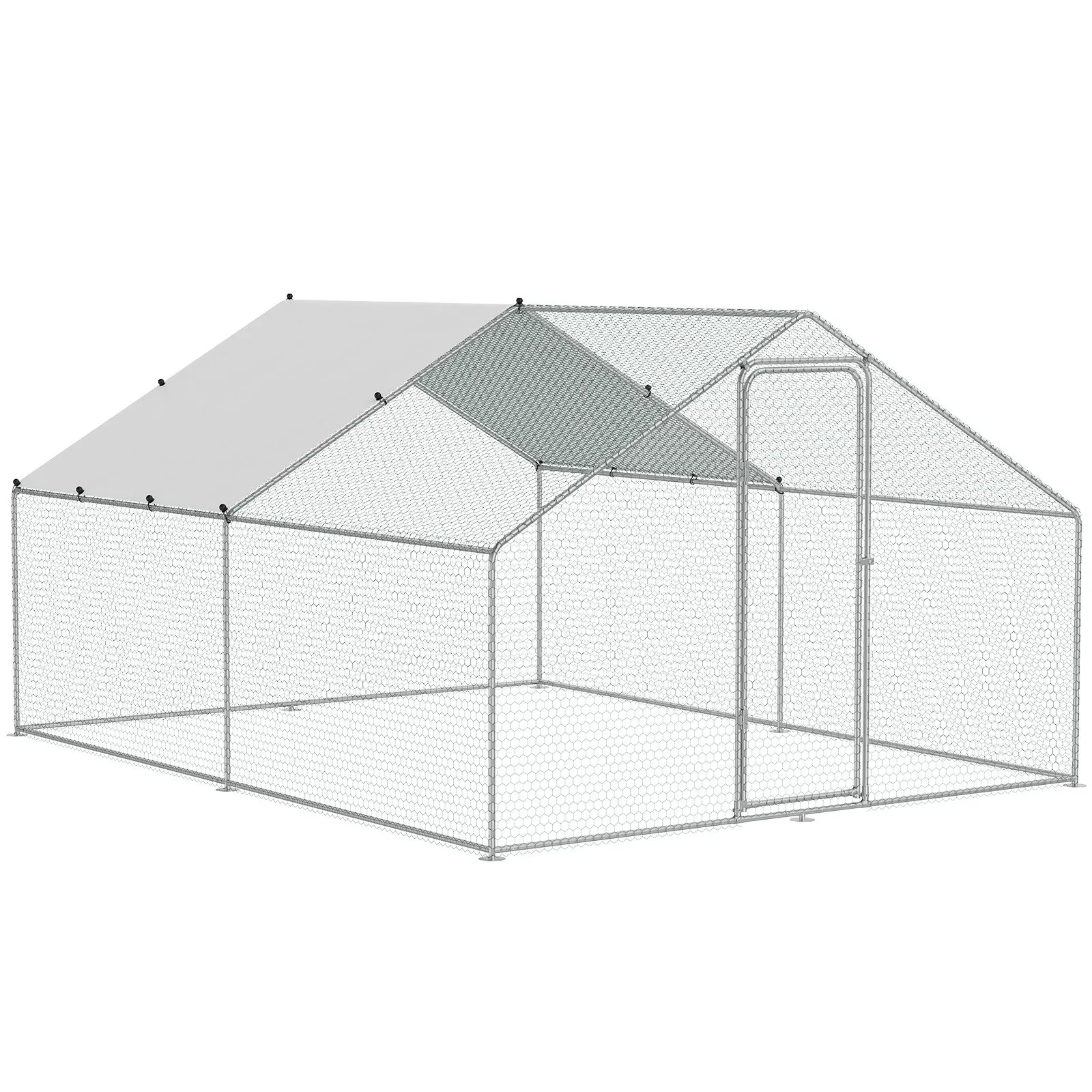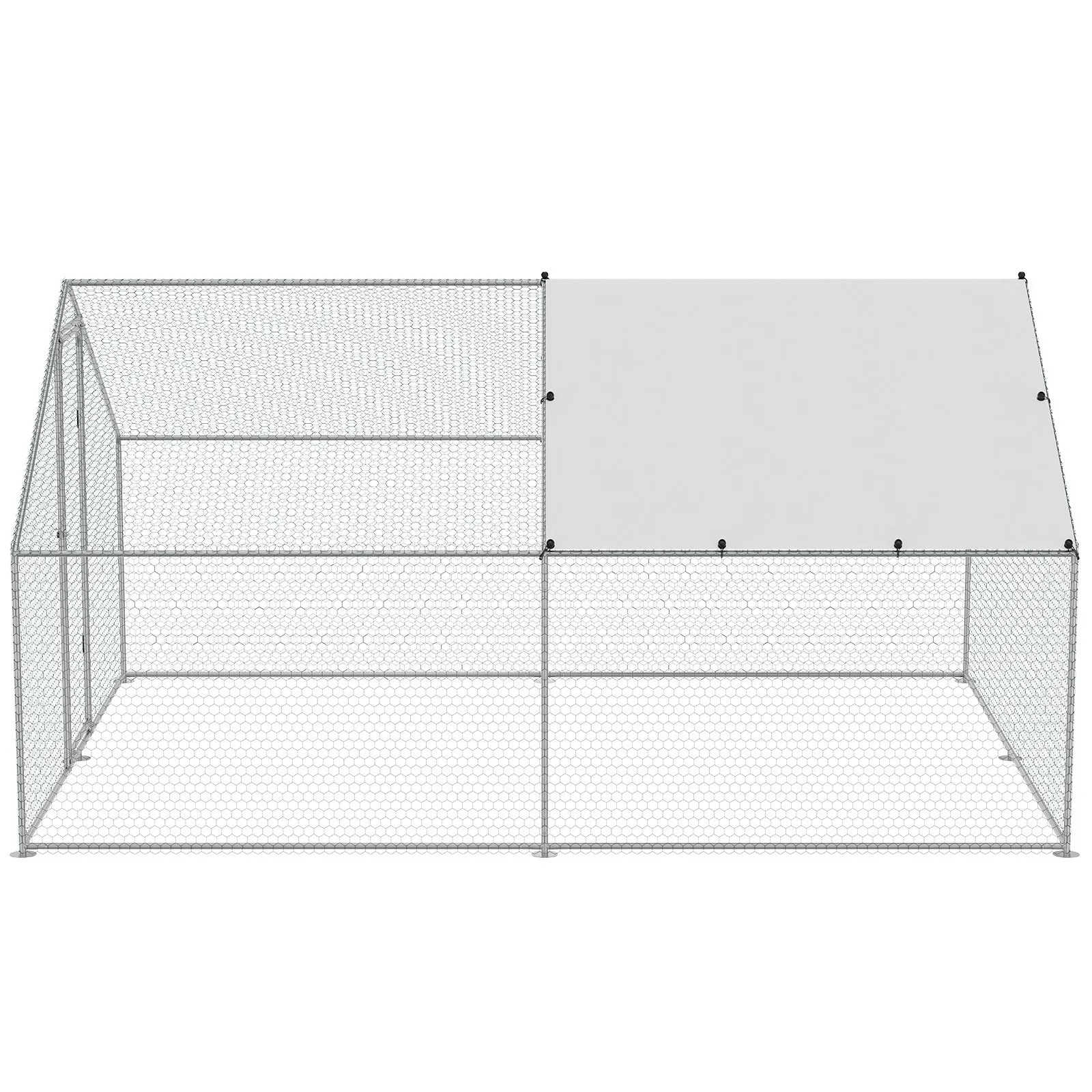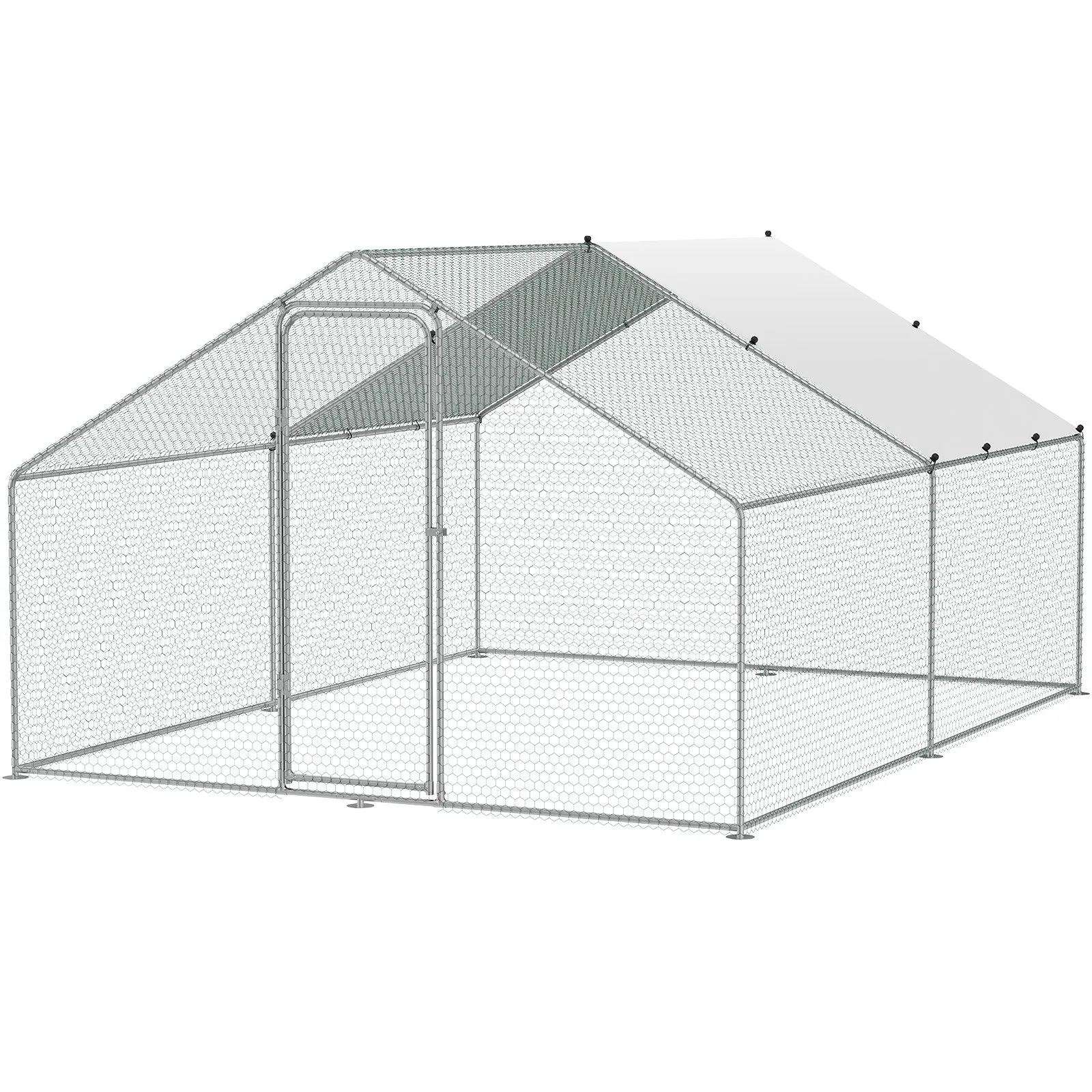 Priestranný obytný priestor: Tento kovový výbeh pre kurníky ponúka veľkorysý priestor s rozmermi 3 x 3,93 x 1,99 m (9,88 x 12,89 x 6,53 stôp) a je vybavený štvorstranným vetraním pre vytvorenie zdravého a pohodlného prostredia. Strecha s PE povlakom poskytuje ochranu pred slnkom, je vodeodolná a odolná voči roztrhnutiu a chráni vašu hydinu pred poveternostnými vplyvmi.