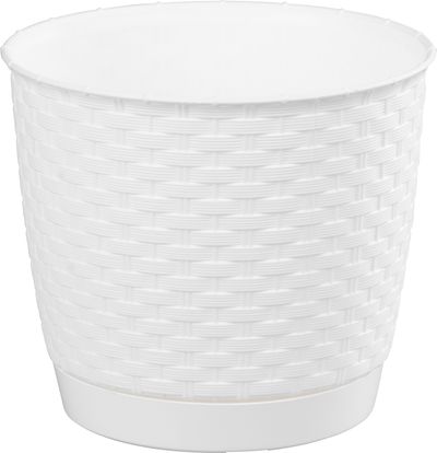 Okrúhly kvetináč s miskou svojou textúrou verne imituje prírodný ratanový výplet. Elegantný motív kvetináča možno využiť v interiéri aj v exteriéri. Dokonale sa hodí do letných záhradiek, kaviarní či reštaurácií.