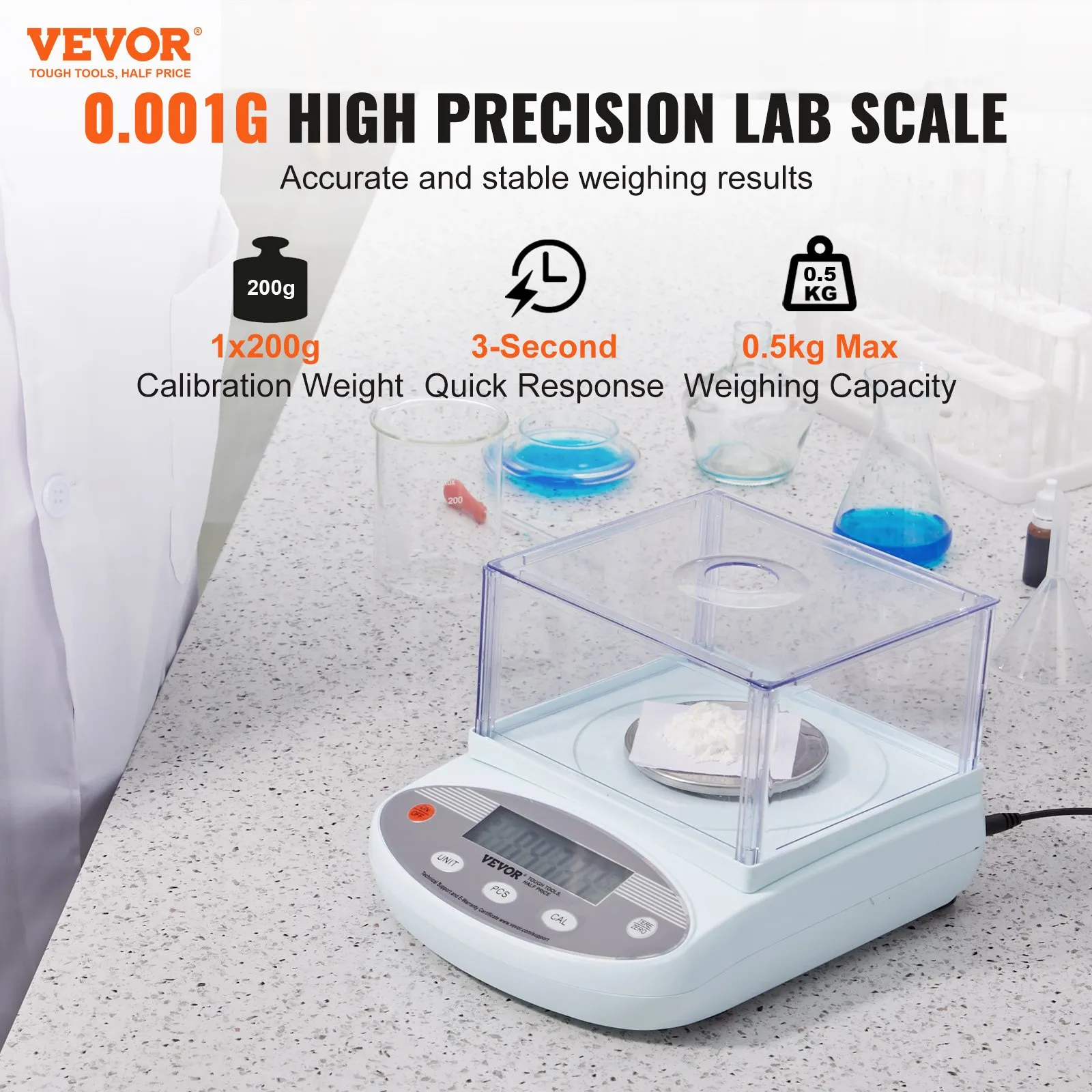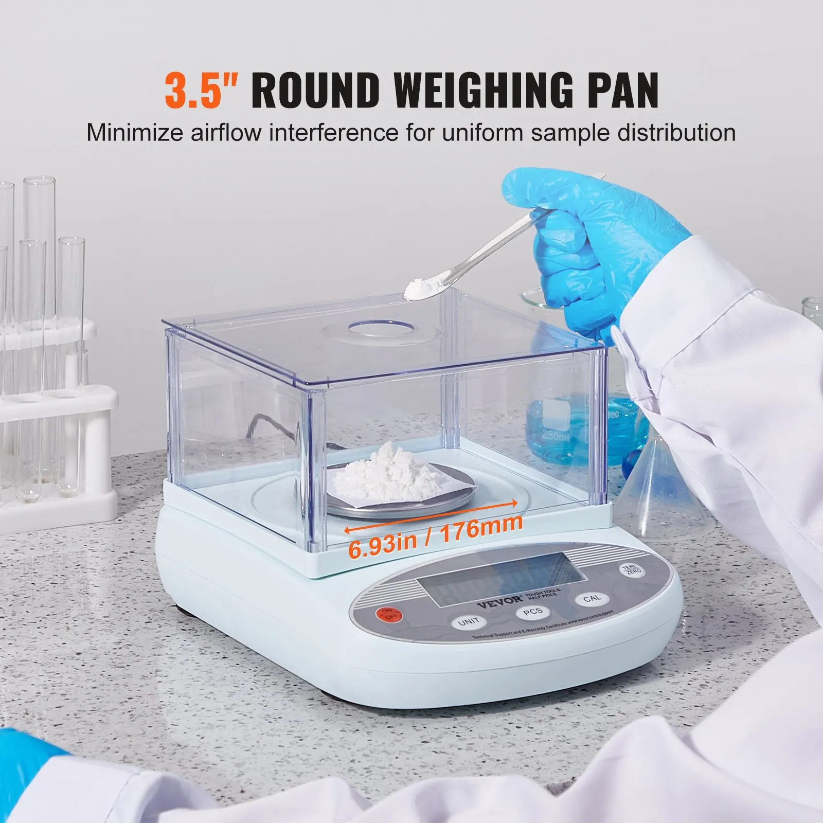 Vysoká presnosť: Analytická váha VEVOR je vybavená vysoko presnými senzormi a kalibračným závažím s hmotnosťou 200 g a zaisťuje rýchle a presné váženie s presnosťou 0,001 g. Je vybavená čelným štítom, ktorý blokuje vonkajšie vplyvy, ako je vietor, vďaka čomu sú výsledky váženia ešte presnejšie.