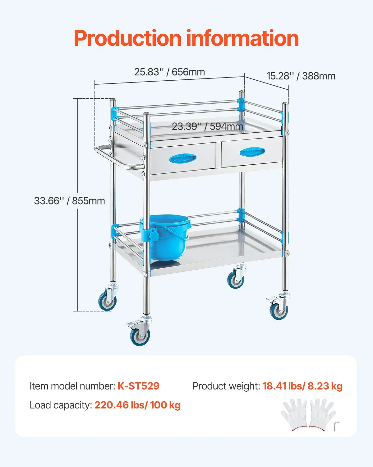 Laboratórny servírovací vozík , 2-úrovňový vozík z nehrdzavejúcej ocele na kolieskach, zdravotnícky vozík s dvoma zásuvkami, zubársky vozík s uzamykateľnými kolieskami a vedrom, pre laboratóriá, nemocnice a zubné použitie