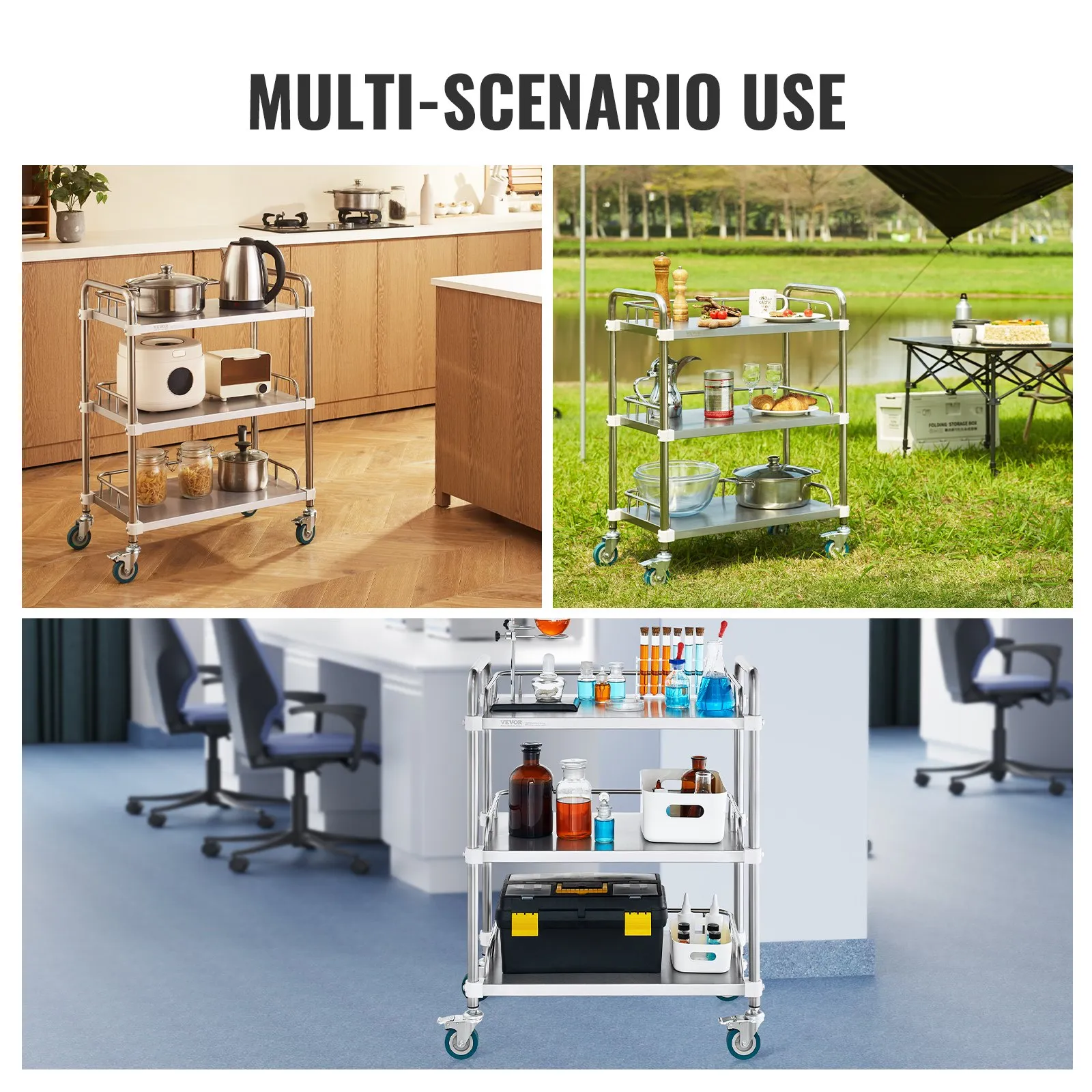 Laboratórny vozík , vozík z nehrdzavejúcej ocele s 3 policami, laboratórny servírovací vozík s otočnými kolieskami, servírovací vozík, zubný vozík pre kliniky, laboratóriá, nemocnice, salóny, 670 x 395 x 867 mm