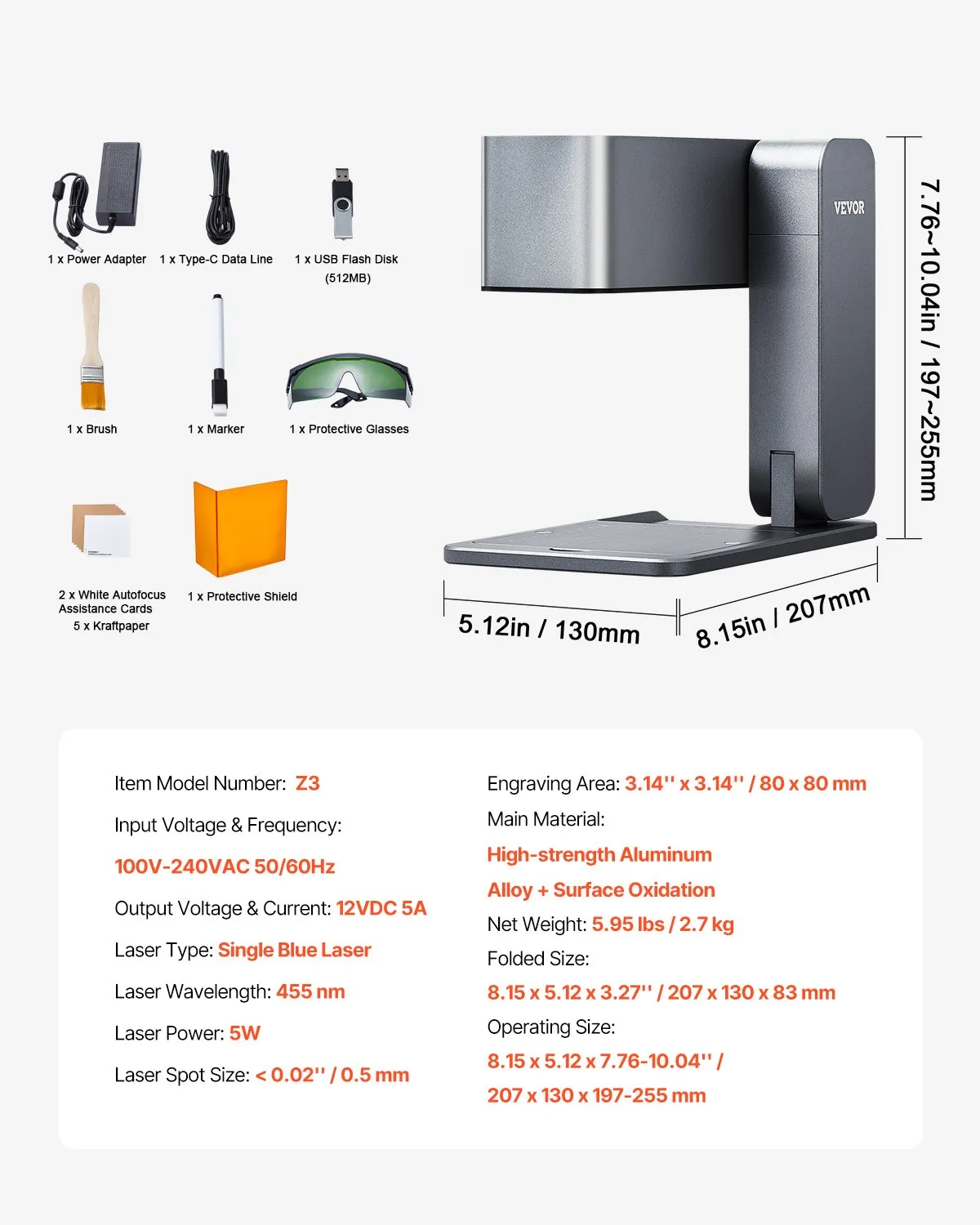 Efektívne gravírovanie: Tento prenosný laserový gravírovací stroj má výstupný výkon 5 W, rýchlosť 600 mm/s a maximálnu gravírovaciu plochu 80 x 80 mm / 3,14 x 3,14 palca. Používa jeden modrý laser na efektívne zvládnutie zložitých gravírovacích úloh a ponúka vynikajúcu podporu pre presné spracovanie.