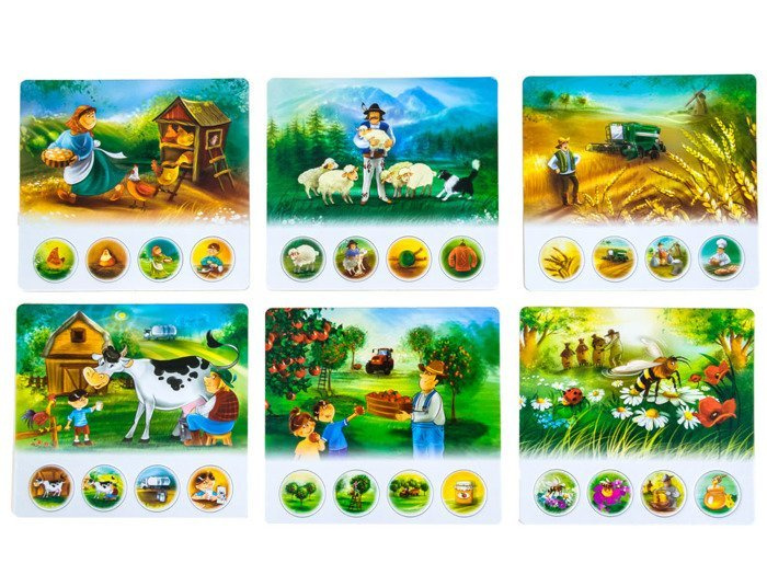 – 24 žetónov s obrázkami, ktoré musí dieťa priradiť k príslušným scénkam.
