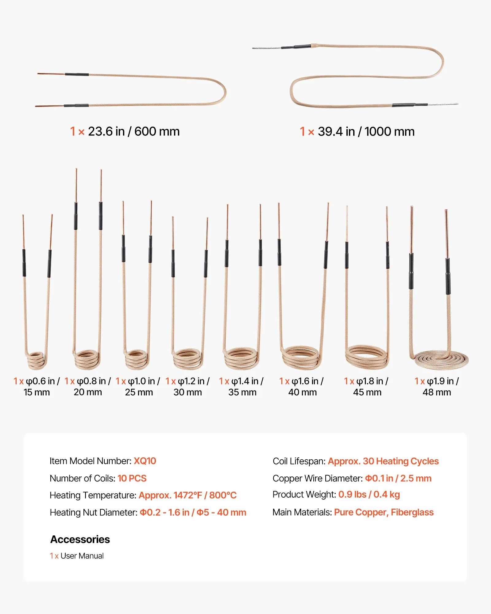 10-dielna sada vykurovacích cievok: Sada vykurovacích cievok obsahuje 8 štandardných cievok s rôznymi priemermi, kompatibilných s maticami od 0,2 do 1,6 palca (5 až 40 mm), a zaisťuje presné a efektívne vykurovanie. Cievky v tvare U a flexibilné sú určené pre nepravidelné diely, dlhé hriadele a zakrivené obrobky. Vhodné pre širokú škálu údržby vozidiel a zariadení.