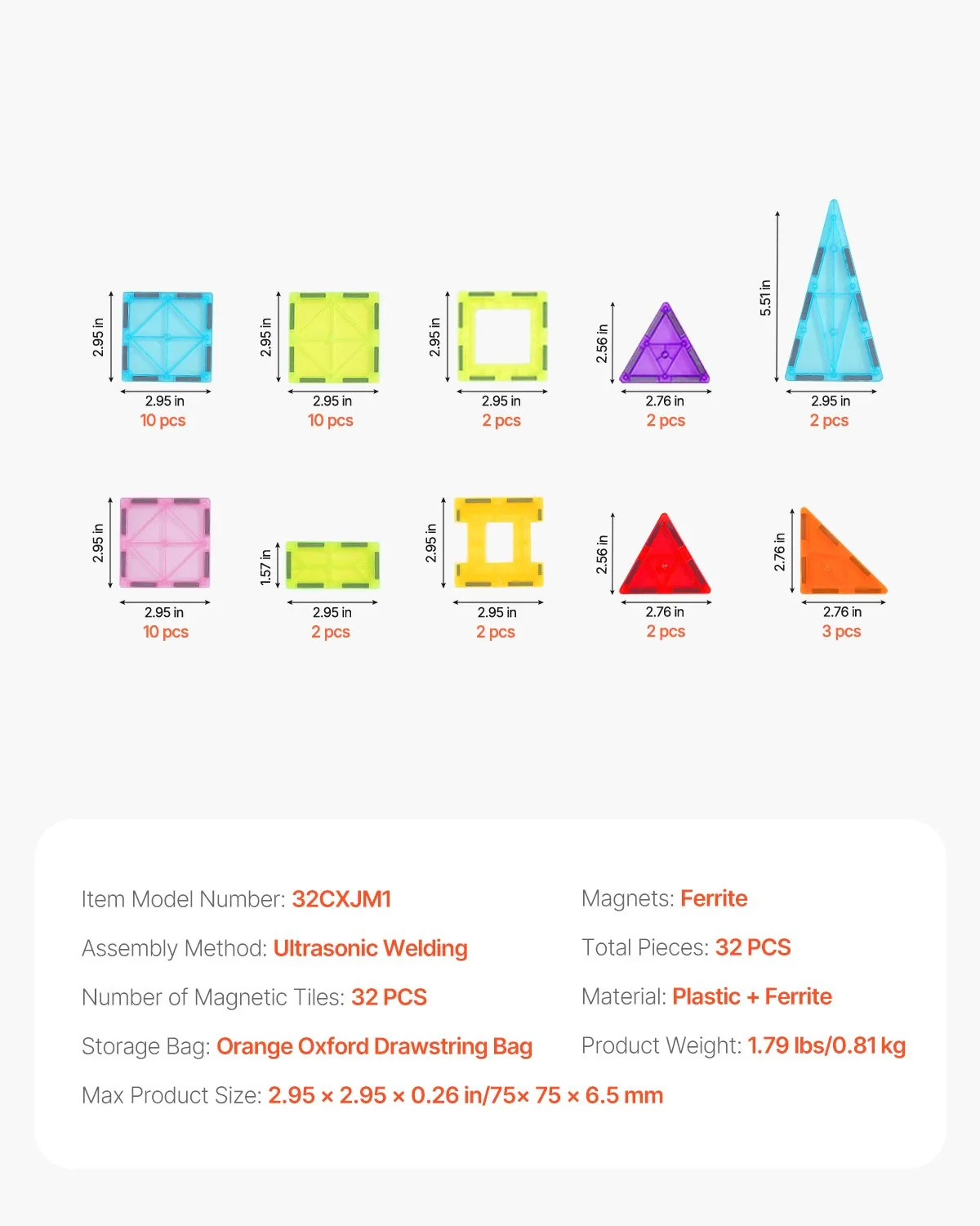 • 32-dielne mega balenie: Popustite uzdu kreativite svojho dieťaťa so sadou magnetických stavebných kociek! Toto vzrušujúce balenie obsahuje 32 magnetických dielikov – 10 štvorcov, 12 rovnostranných trojuholníkov a 2 pravouhlé trojuholníky – ideálne na stavbu vysokých konštrukcií, budov a hradov, ktoré pevne stoja. Dodáva sa tiež s praktickým nylonovým vreckom so sťahovacou šnúrkou pre jednoduchú prepravu.