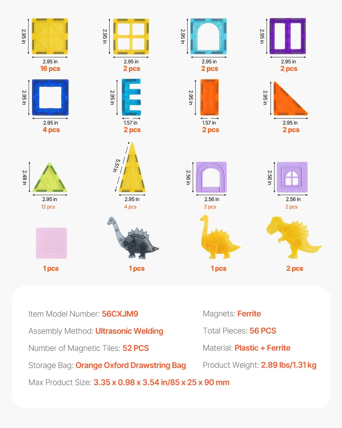 56-dielne mega balenie: Popustite uzdu kreativite svojho dieťaťa so sadou magnetických stavebných kociek! Toto vzrušujúce balenie obsahuje 56 magnetických stavebných kociek – 16 štvorcov, 12 rovnostranných trojuholníkov a 2 pravouhlé trojuholníky – ideálne na stavbu stabilného sveta zvierat. Dodáva sa tiež s praktickým nylonovým vreckom so sťahovacou šnúrkou pre jednoduchú prepravu.