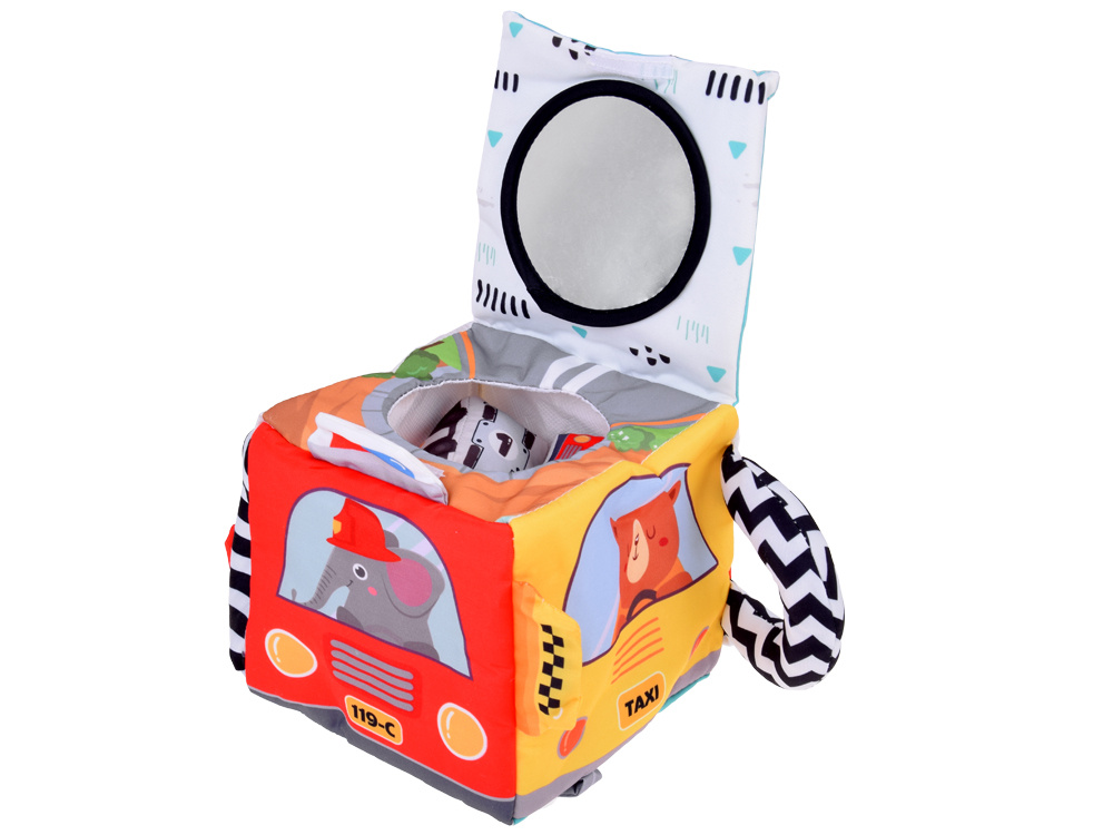 - Farebná látková kocka s bezpečnostným zrkadlom a čiernobielymi mäkkými rukoväťami.