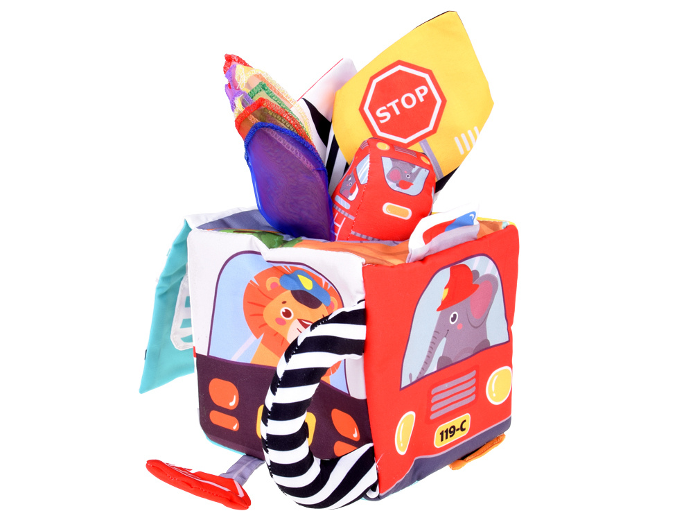 Toto je viac než len kocka – je to nástroj, ktorý doslova rastie s vaším dieťaťom. Bohaté farby, rozmanitosť tvarov a skryté prekvapenia neustále priťahujú pohľad a povzbudzujú k objavovaniu. Vaše dieťatko objavuje nové textúry, vyťahuje farebné šatky a lopty a skúma fascinujúci svet vozidiel a dopravných značiek.
