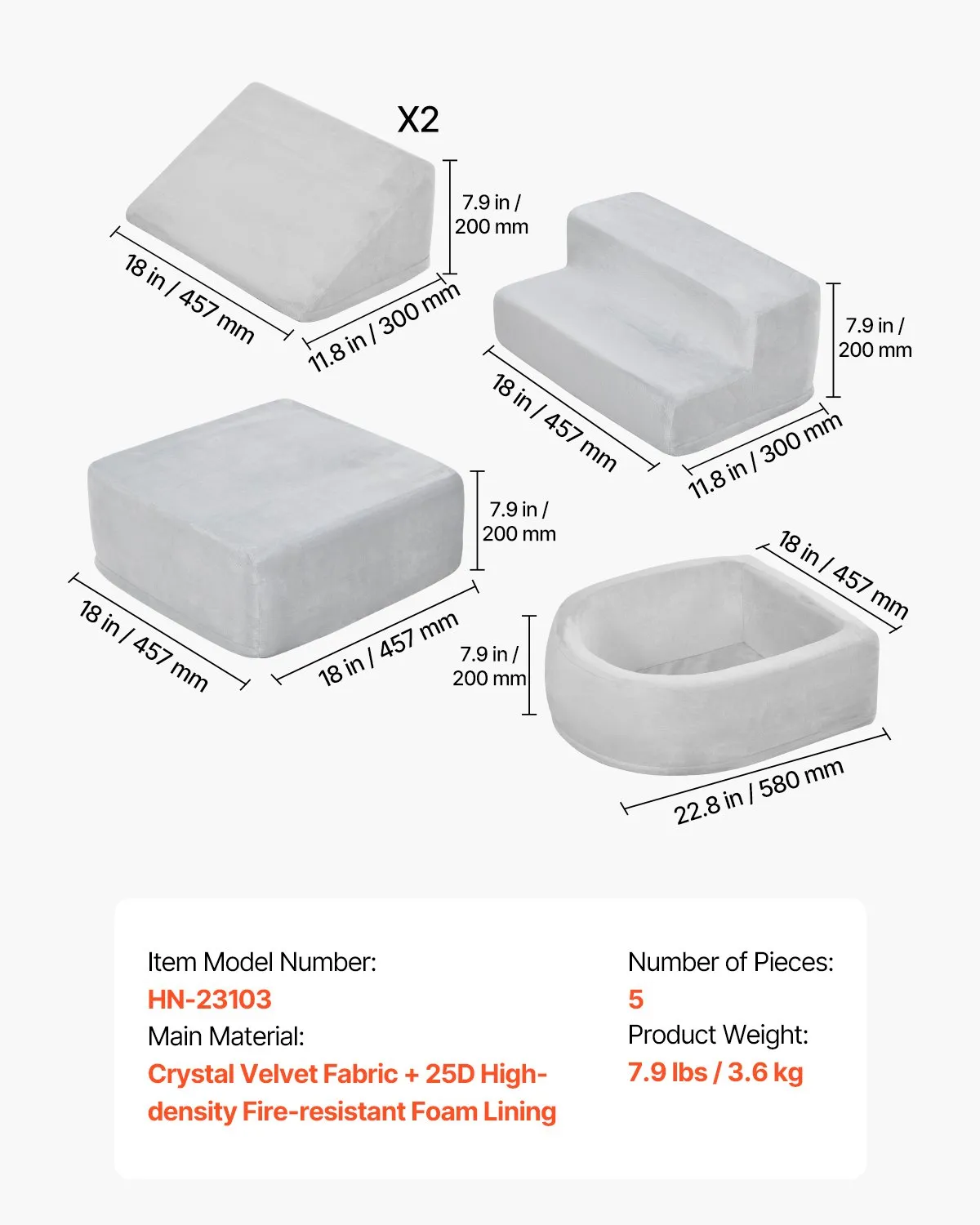Bezpečné spojenia suchým zipsom: Jednoducho prepínajte medzi rôznymi konfiguráciami vďaka integrovaným suchým zipsom na lezeckých blokoch. Spodná strana má protišmykový povrch, ktorý udržiava moduly stabilné a bezpečné, čo umožňuje aktívnym deťom bez obáv skákať a gúľať sa.