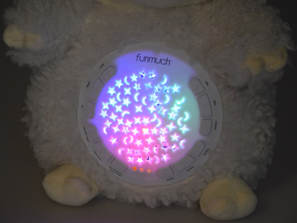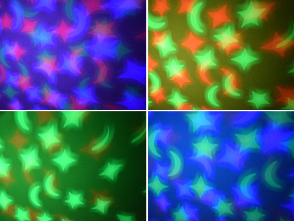 Počas prehrávania melódií alebo zvukov projektor premieta na strop a steny farebné hviezdy a mesiace v červenej, zelenej a modrej farbe. Tento efekt je obzvlášť krásny v zatemnenej miestnosti, kde vytvára príjemnú a pokojnú atmosféru, ktorá prispieva k zaspávaniu.