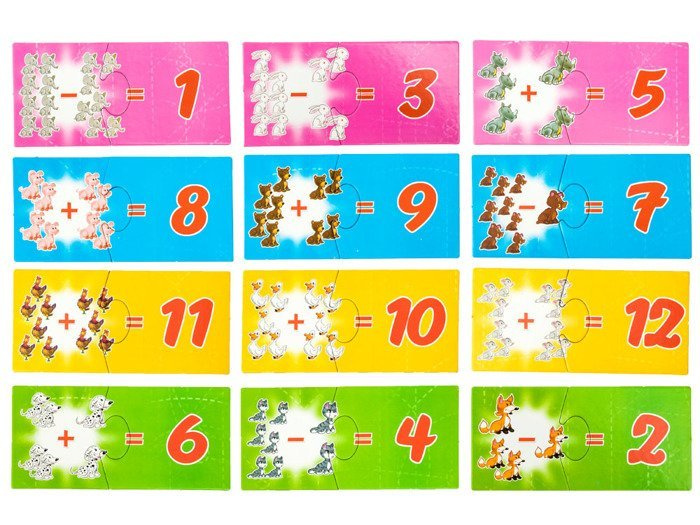 Obsah balenia: 24 puzzle (12 párov) s obrázkami a číslami