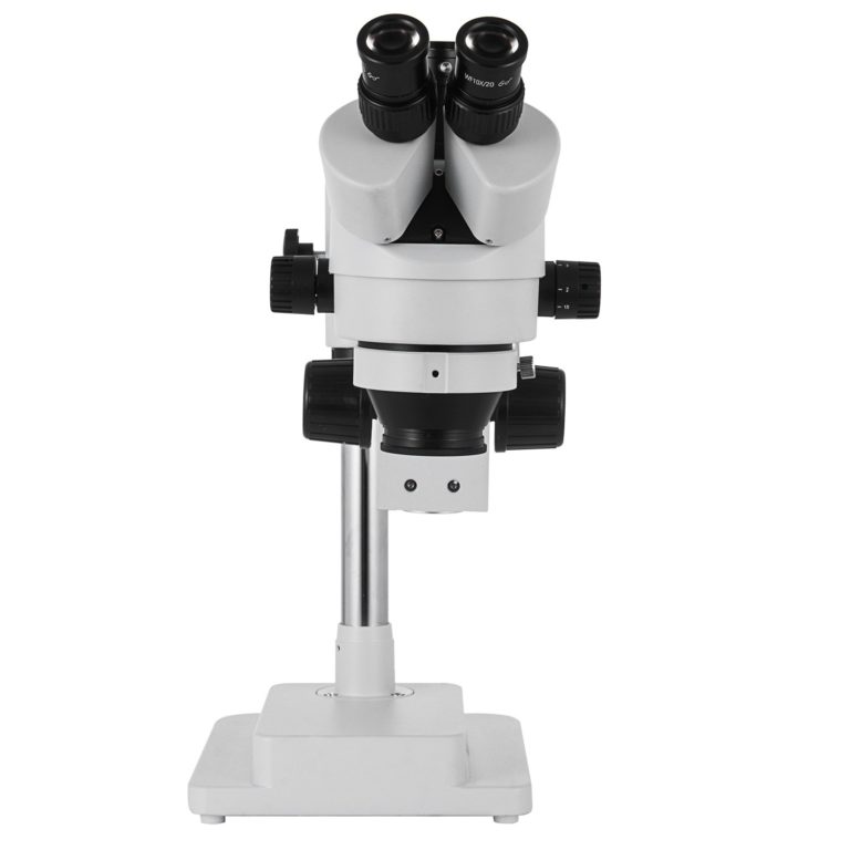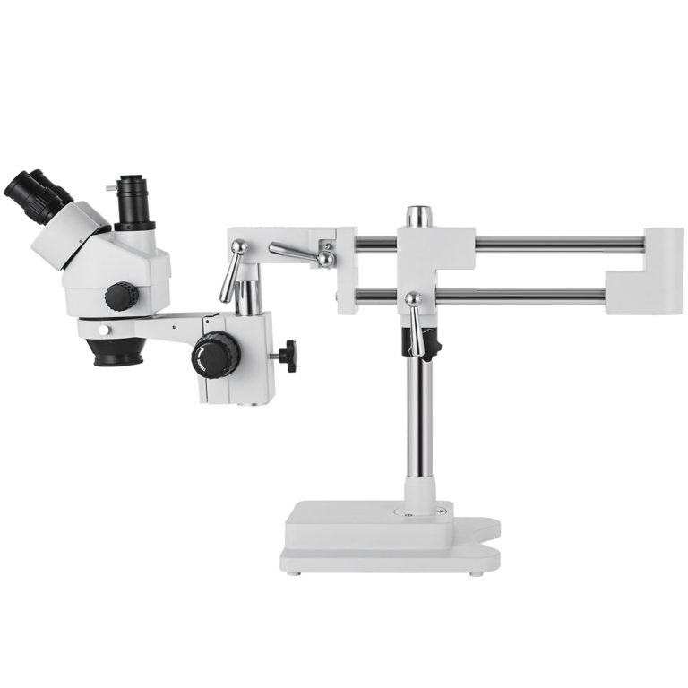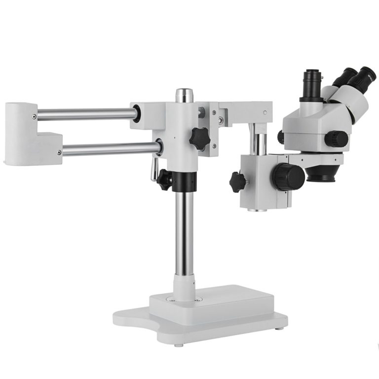 Dvojramenný stojan – Trojokulárny mikroskop so stereozoomom je navrhnutý s dvojramenným výložníkom, ktorý umožňuje pracovnú vzdialenosť až 20 cm. Dá sa ľahko nastaviť dopredu/dozadu a hore/dole na pokrytie veľkej pracovnej plochy.