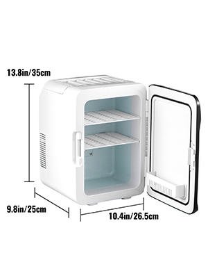 Kapacita 10 litrov – Naša chladnička má kapacitu 10 litrov a jej vnútorné rozmery sú 20 x 15 x 28,5 cm, čo je schopné pojať 10 plechoviek štandardných nápojov, a je tiež vybavená odnímateľnými policami a košíkmi, ktoré poskytujú flexibilitu pri skladovaní rôznych položiek, ako sú jogurty, ovocie, mlieko, fľaše atď.