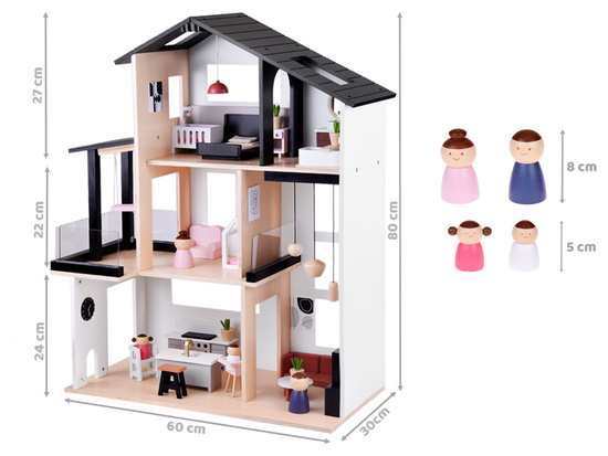 Tento jedinečný drevený domček pre bábiky v štýle loftu je perfektným doplnkom detskej izby. Má dve poschodia a ponúka rôzne interiéry: elegantnú obývaciu izbu, modernú kuchyňu, útulnú spálňu, pôvabnú detskú izbu, funkčnú kúpeľňu a priestranný balkón s terasou a štýlovým zábradlím.