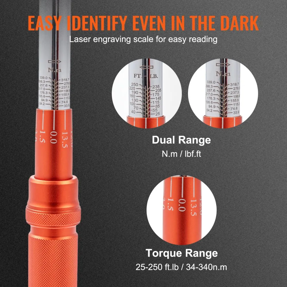 Jasné odčítanie: Výrazná, ľahko čitateľná, laserom gravírovaná dvojrozsahová stupnica zaisťuje jasné odčítanie aj za zlých svetelných podmienok, čo vám umožňuje efektívne pracovať v akomkoľvek prostredí. Okrem toho je tento momentový kľúč s uhlom 1/2″ odolný voči opotrebovaniu, vďaka čomu je ideálny na použitie v náročných pracovných podmienkach.