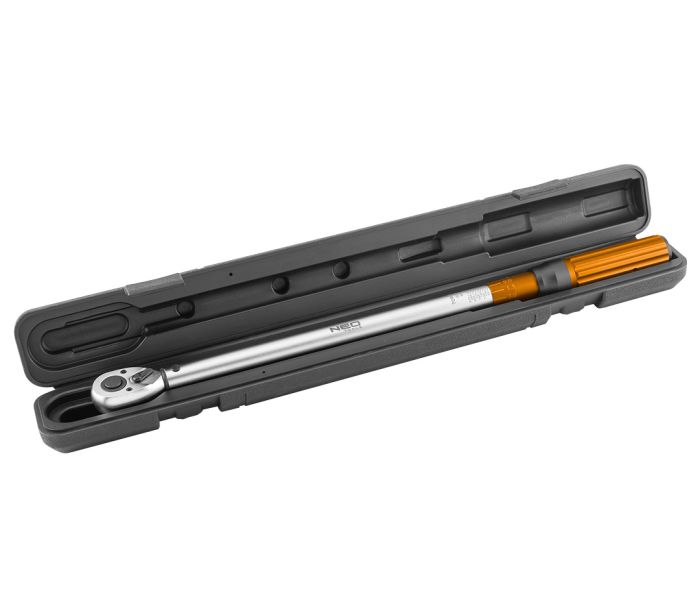 Obojsmerný momentový kľúč 1/2″, 60-330Nm, 08-837, NEO je nepostrádateľným pomocníkom v autodielni, na bicykli alebo pri domácich opravách. Koncovka kľúča umožňuje namontovať nástrčky veľkosti 1/2″. Kľúč umožňuje presné nastavenie krútiaceho momentu, čo je dôležité najmä v profesionálnych aplikáciách. Vďaka spínaču je možné zaskrutkovať skrutky a matice s pravým alebo ľavým závitom, s krútiacim momentom 60 až 330 Nm. Nastavenie veľkosti krútiaceho momentu je možné pomocou gombíka na rukoväti kľúča.