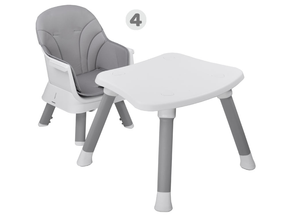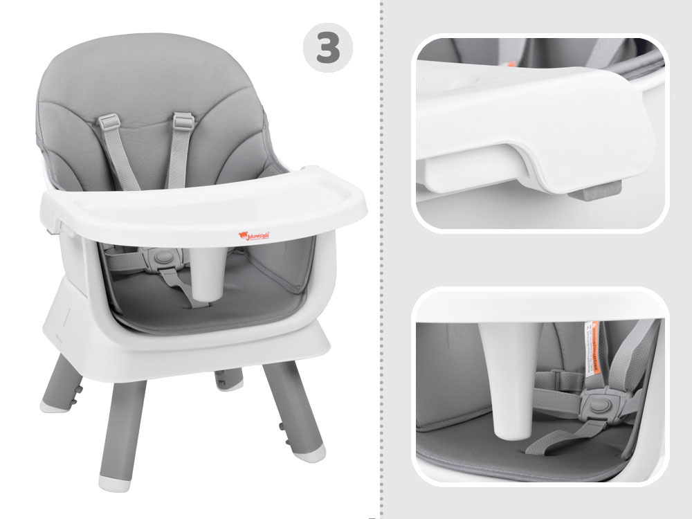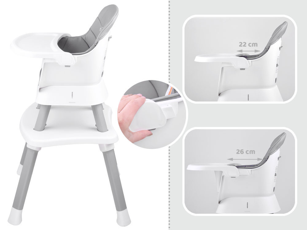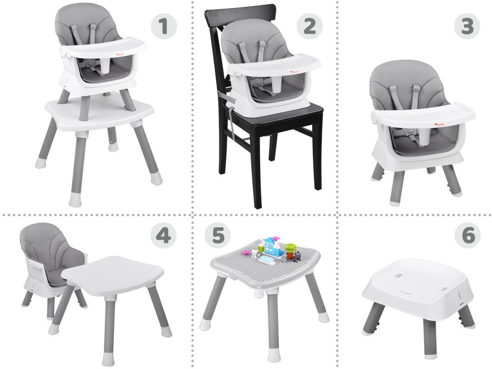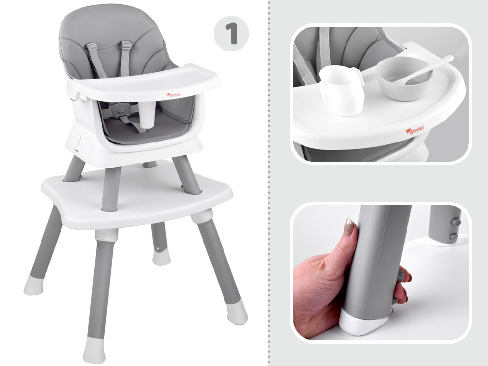 Táto 6-v-1 detská stolička  je ideálna pre deti od 6 mesiacov, ktoré už začali samostatne sedieť. Tento modulárny, moderný kus nábytku doplní každú detskú izbu, obývačku alebo kuchyňu. Jeho všestranný dizajn z neho robí perfektný doplnok k jedálenskému stolu alebo detskému kútiku. Pohodlné, dobre tvarované sedadlo je vybavené päťbodovým bezpečnostným pásom a bezpečnostným zámkom, ktorý zabraňuje pošmyknutiu. Sedadlo je priedušné a vyrobené z ľahko čistiteľného materiálu, čo je kľúčové pre udržiavanie čistoty. Sedadlo má odnímateľný, ľahko čistiteľný podnos. Nohy stoličky majú protišmykové podložky. Tento multifunkčný kus rastie s vaším dieťaťom a ľahko sa prispôsobí jeho potrebám.