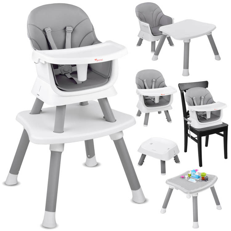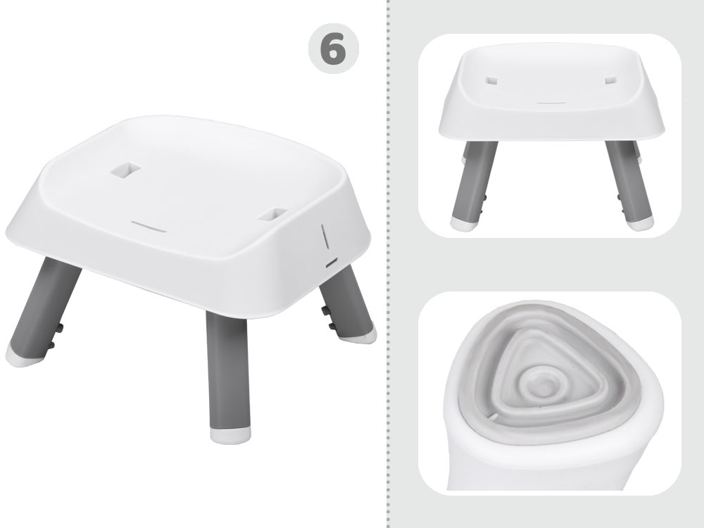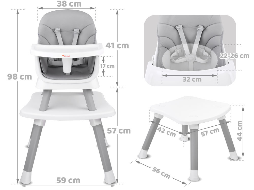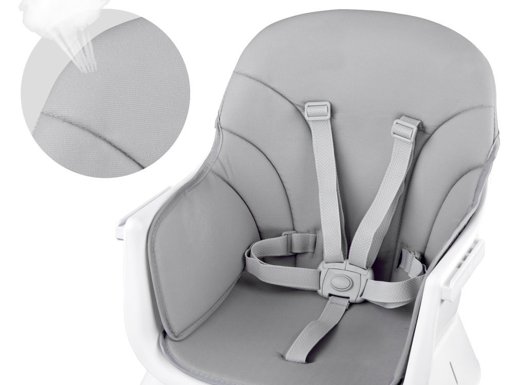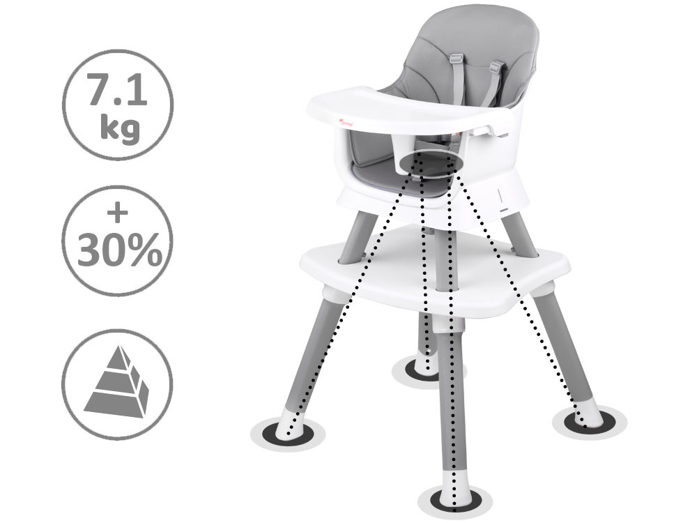 Táto 6-v-1 detská stolička  je ideálna pre deti od 6 mesiacov, ktoré už začali samostatne sedieť. Tento modulárny, moderný kus nábytku doplní každú detskú izbu, obývačku alebo kuchyňu. Jeho všestranný dizajn z neho robí perfektný doplnok k jedálenskému stolu alebo detskému kútiku. Pohodlné, dobre tvarované sedadlo je vybavené päťbodovým bezpečnostným pásom a bezpečnostným zámkom, ktorý zabraňuje pošmyknutiu. Sedadlo je priedušné a vyrobené z ľahko čistiteľného materiálu, čo je kľúčové pre udržiavanie čistoty. Sedadlo má odnímateľný, ľahko čistiteľný podnos. Nohy stoličky majú protišmykové podložky. Tento multifunkčný kus rastie s vaším dieťaťom a ľahko sa prispôsobí jeho potrebám.