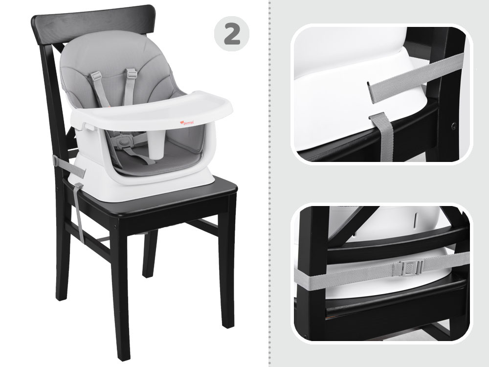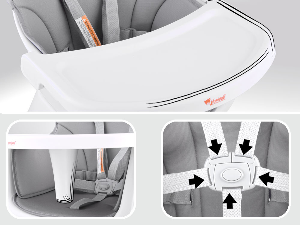 Sedadlo sa ľahko montuje, čo uľahčuje jeho úpravu. Všetko funguje pomocou jednoduchého systému klik a západka, vďaka čomu je stabilné a bezpečné. Samotné sedadlo má 5-bodový bezpečnostný pás a zámok medzi nohami dieťaťa, ktorý zabraňuje skĺznutiu dieťaťa. Popruhy, ktoré pripevňujú sedadlo k stoličke, sú pevné, čo umožňuje dieťaťu sedieť s rodičmi pri stole a spoločne si vychutnať jedlo.