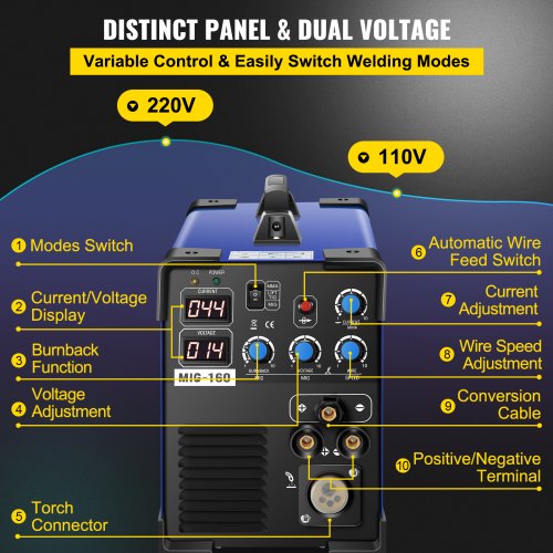 Jednoduchý ovládací panel a 3 v 1 – Zváračka má režimy MIG MMA TIG. Zváracia stanica má tlačidlá na podporu rôznych potrieb nastavenia prúdu a riadenia rýchlosti drôtu. Digitálny LCD displej je prehľadný a dobre čitateľný. S týmto multifunkčným zváracím strojom ušetríte čas a peniaze pri plnení rôznych zváracích potrieb.