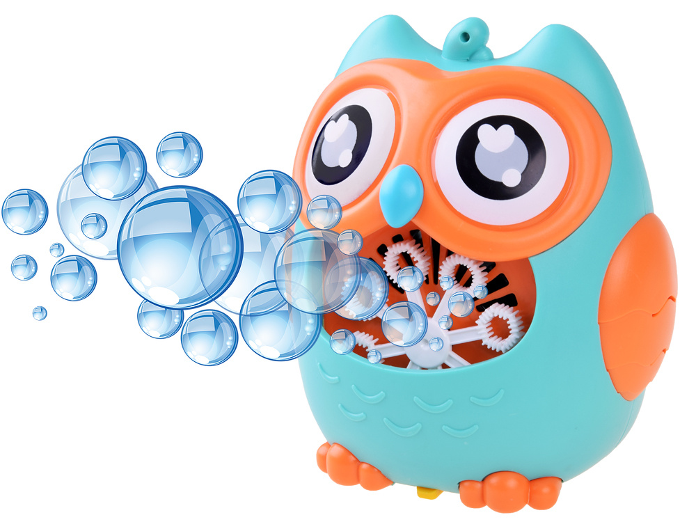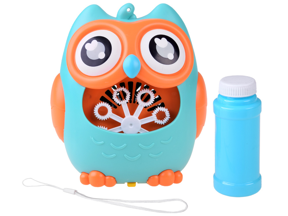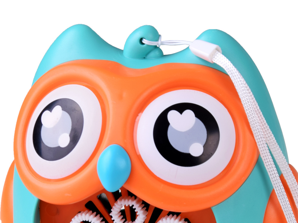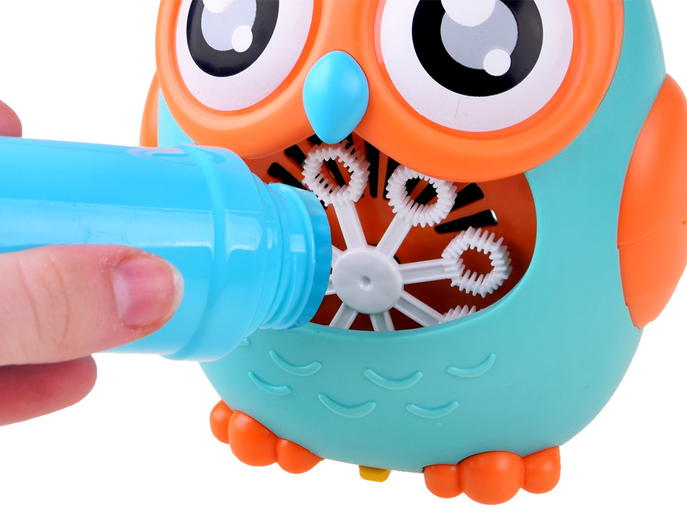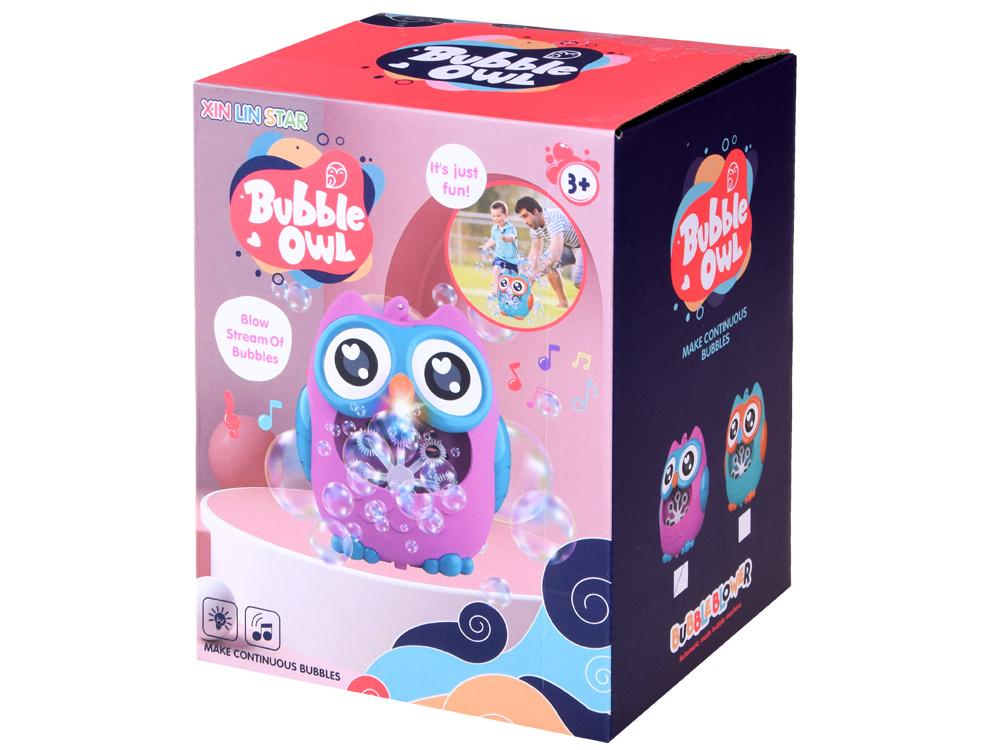 Mydlové bubliny sú obľúbenou hrou malých i veľkých detí. Senzačný strojček na výrobu mydlových bublín v tvare pôvabnej Sovičky určite urobí veľa radosti každému dieťaťu. Hračka vám umožňuje fúkať farebné bubliny zo stroja. Stačí naliať tekutinu do otvoru, kde je kotúč s očkami, zapnúť tlačidlo umiestnené za jedným z uší sovy, zapnúť ventilátor a otáčať kotúčom, ktorý pri roztočení uvoľňuje magické dúhové bublinky. To však nie je všetko, za druhým uchom sovy je skrytý gombík s poznámkou.Po stlačení sa ozve veselá melódia. Po zapnutí hračky sa rozsvieti červené svetielko, vďaka čomu bude zábava pre vaše deti zaujímavejšia, najmä v tme. Na temene hlavy sovy je šnúrka, vďaka ktorej je možné bublifuk zavesiť kdekoľvek.