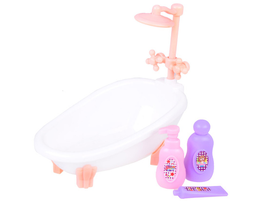 kreslo – fén – zrkadlo – kefa na vlasy – fľaštička na parfum – rúž – kufor – kabelka Kúpeľňa: – retro vaňa so sprchovacím kútom – dve stoličky – toaletný stolík s umývadlom, zrkadlom, vešiak na uteráky – toaleta so vešiakmi na toaletný papier a uteráky – 2 x hrnček – 2 x zubná kefka – 2 x tuba zubnej pasty – tuba na krém – mydlovňa s mydlom – fľaša na šampón – fľaša na sprchový gél Rozmery: – šatníková skriňa 16 x 12 x 5,5 cm – posteľ 16 x 9,5 x 8 cm – toaletný stolík 13,5 x 10 x 4 cm – vaňa 12,5 x 11 x 7 cm – toaletný stolík s umývadlom 14 x 13 x 5 cm – stena s toaletou 12,5 x 14 x 8 cm Táto nábytková sada je ideálna na zariadenie domčeka pre bábiky, ale môže stáť aj samostatne. Sada je balená vo farebnom kartónovom obale.