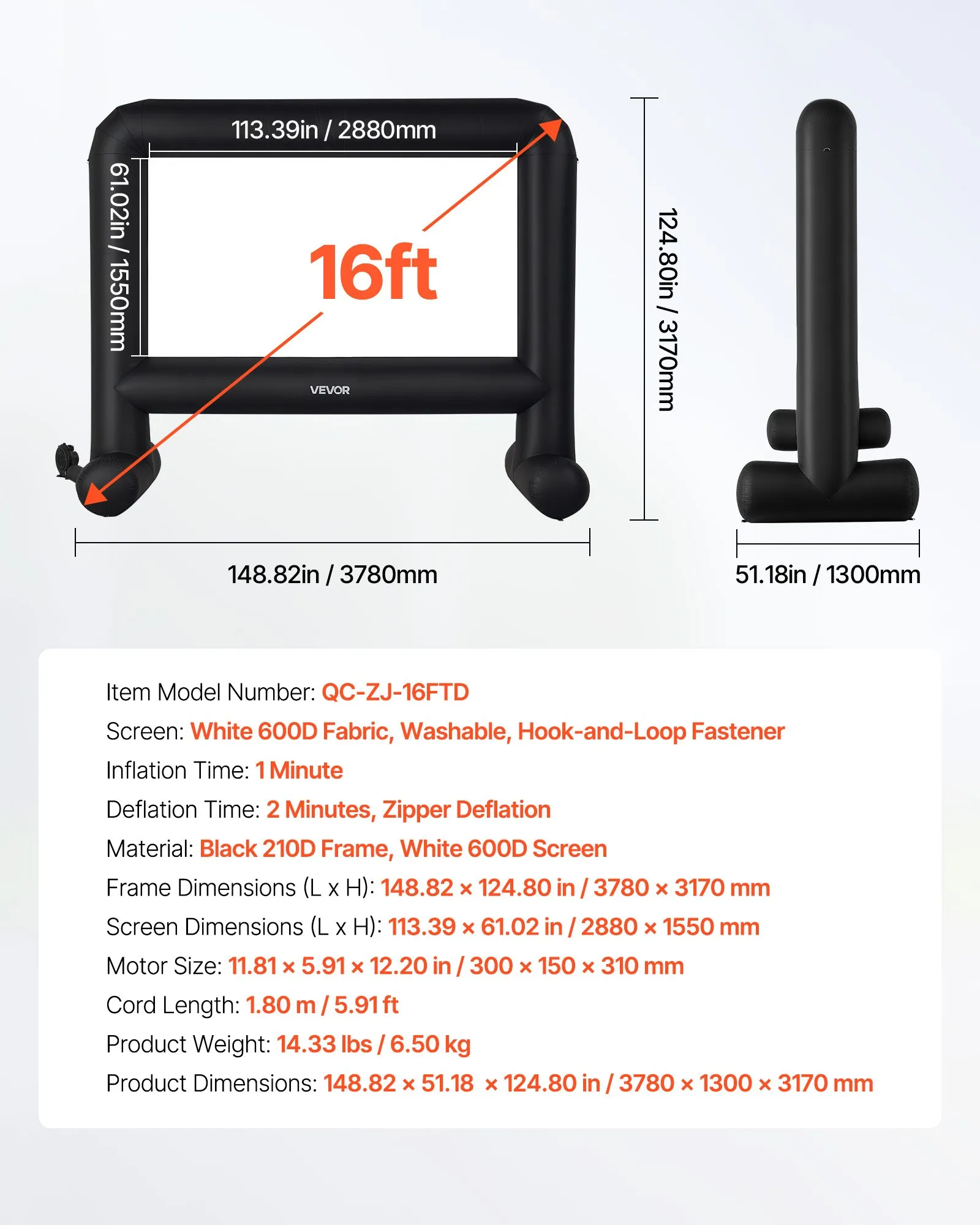 Nafukovacie filmové plátno vyrobené z 600D, premietacie plátno s prenosným úložným vreckom, 16:9, filmová projekcia pre domáce kino, párty a zábavu pri bazéne (378 x 130 x 317 cm)