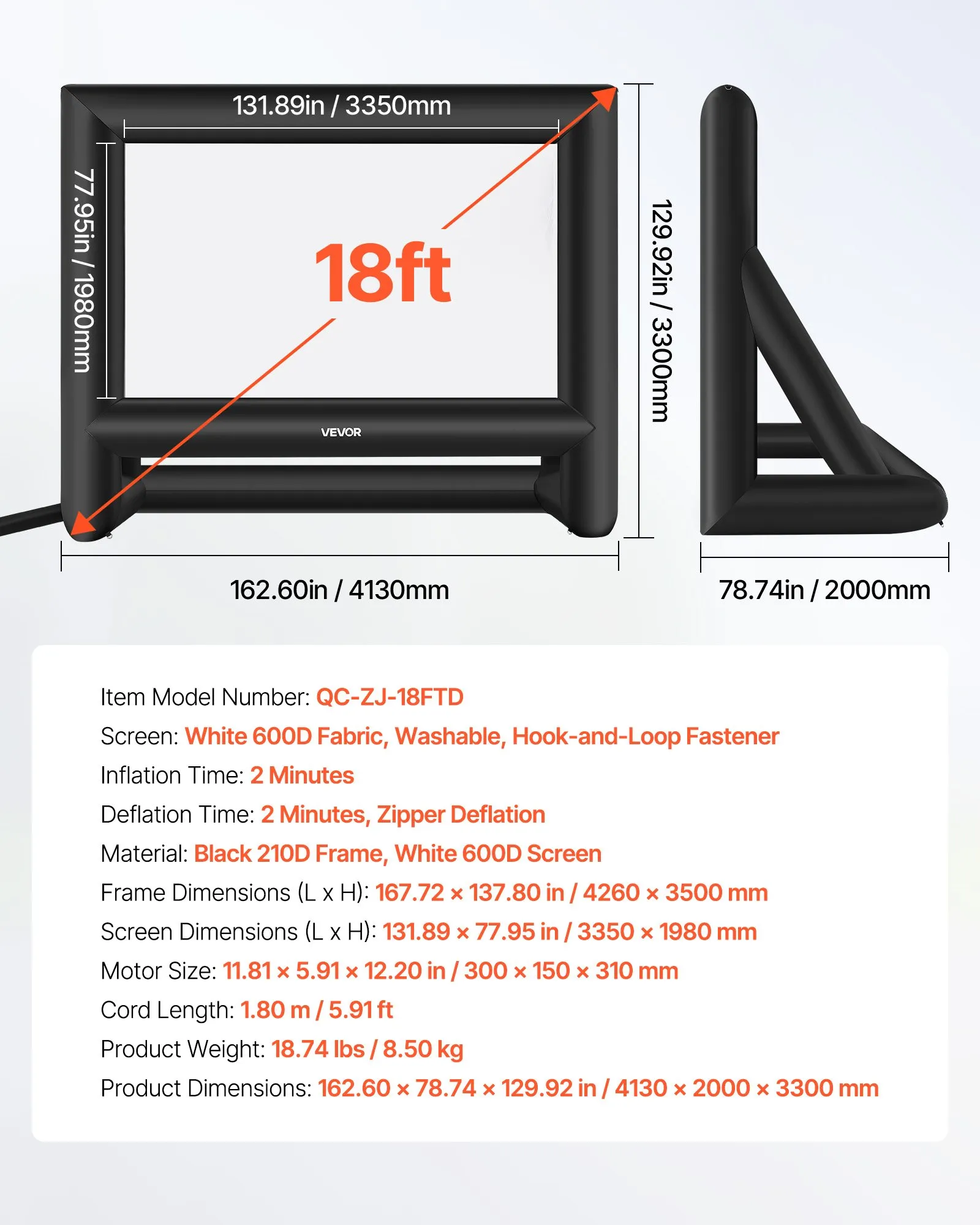 Nafukovacie filmové plátno vyrobené z 600D, premietacie plátno s prenosným úložným vreckom, 16:9, filmová projekcia pre domáce kino, párty a zábavu pri bazéne (413 x 200 x 330 cm)