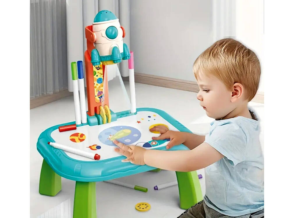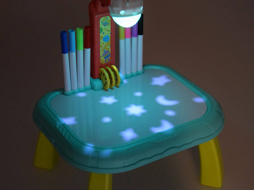 Navyše, keď zapnete tlačidlo, projektor premieta hviezdy na stenu alebo strop a prenesie vaše dieťa na cestu vesmírom! V inom režime hračka zobrazuje tematické obrázky , ako je vesmírny svet, zvieratá, vozidlá alebo podmorský svet, ktoré je možné obkresliť na špeciálnej tabuli. Je to skvelý spôsob, ako si váš malý objaviteľ môže precvičiť ruky, rozvíjať svoju predstavivosť a rozprávať príbehy o vzdialených planétach a medzihviezdnom cestovaní.