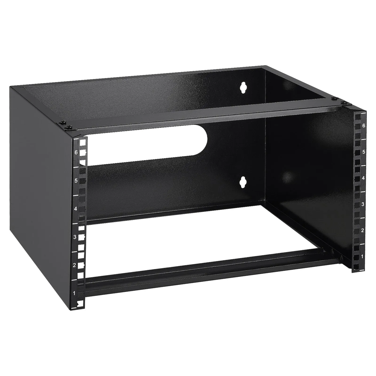 6U nástenný rack: Tento sieťový rack sa vyznačuje otvoreným rámom a 2-stĺpovou konštrukciou, ktorá podporuje maximálnu montážnu hĺbku 14 palcov/35,6 cm. Dodáva sa s predinštalovanými uzemňovacími kolíkmi, otvormi na vedenie káblov a montážnymi otvormi, vďaka čomu je inštalácia a kabeláž hračka.